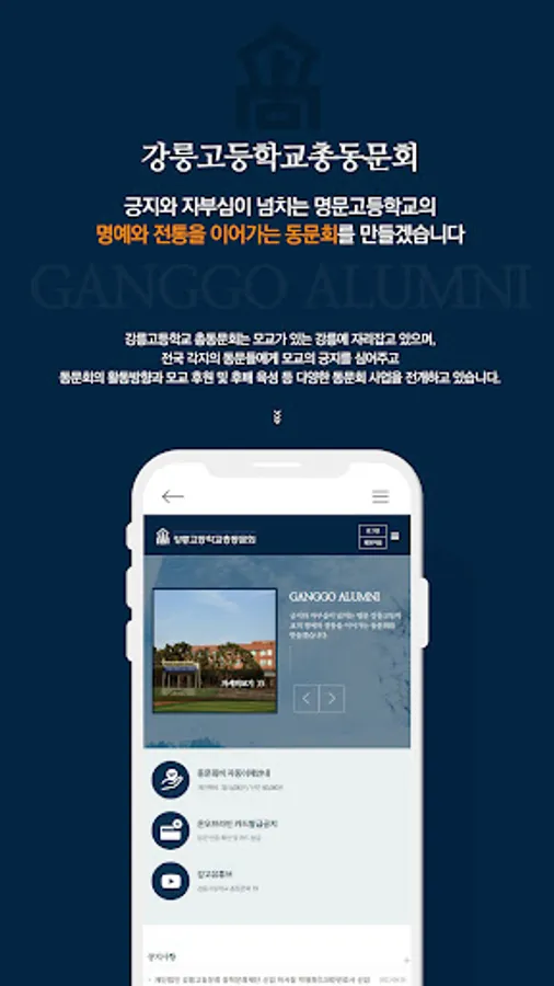 동문회 조직을 기별, 지역별, 동호회별 동문으로 폭넓게 구축하고, 서로 촘촘하게 연결하여 전 강고 동문이 하나가 되도록 하겠습니다. ‘만나서 즐겁고 힘이 되는 동문회’를 만들겠습니다.