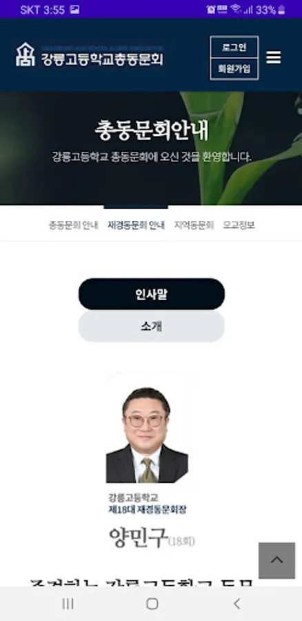 동문회장에 취임하면서 열심히 하겠다는 각오의 다짐을 말씀드리겠습니다. 2만 3천 동문을 대표하는 자리이니 만큼 무거운 책임감을 느끼고, 전 동문 한분 한분을 다 만날 각오로 열심히 몸으로 뛰는 회장이 되겠습니다.
