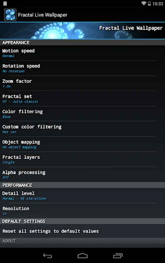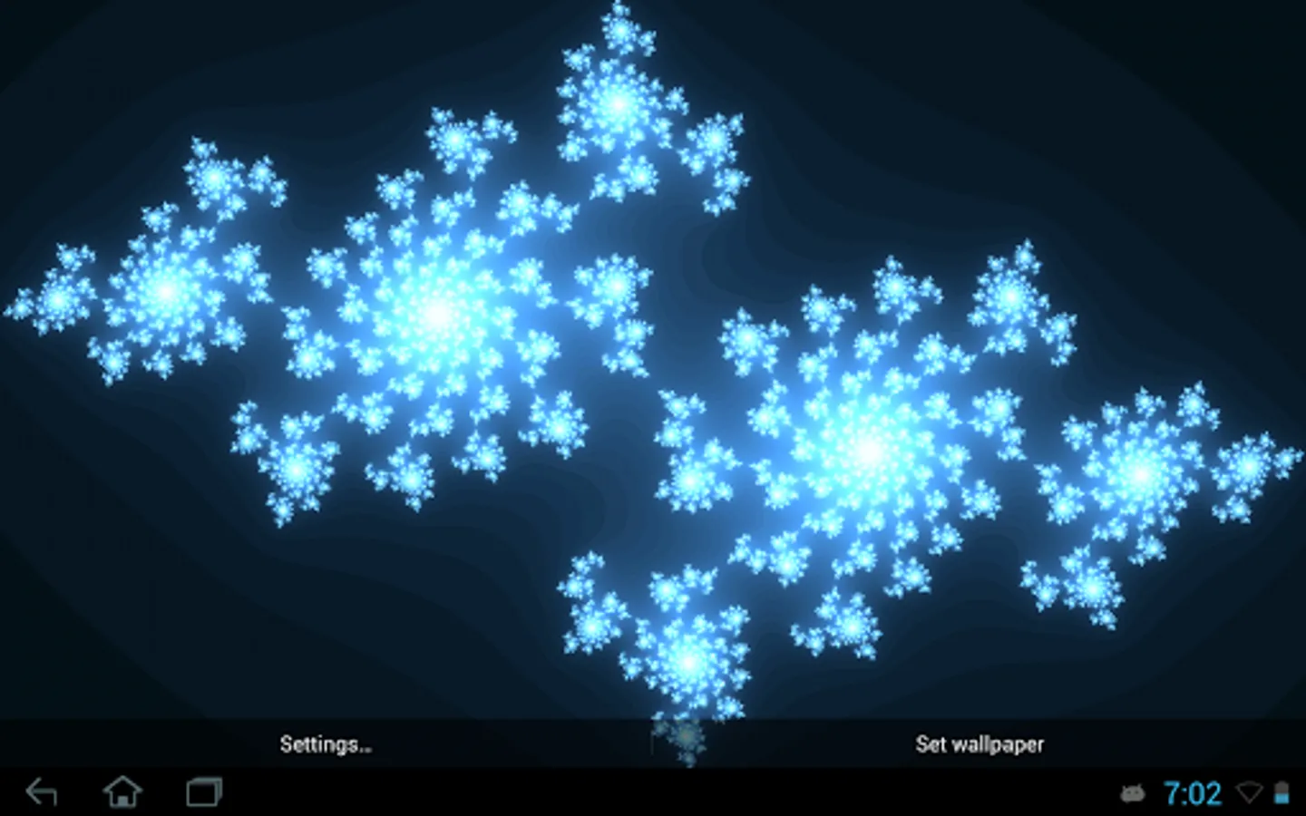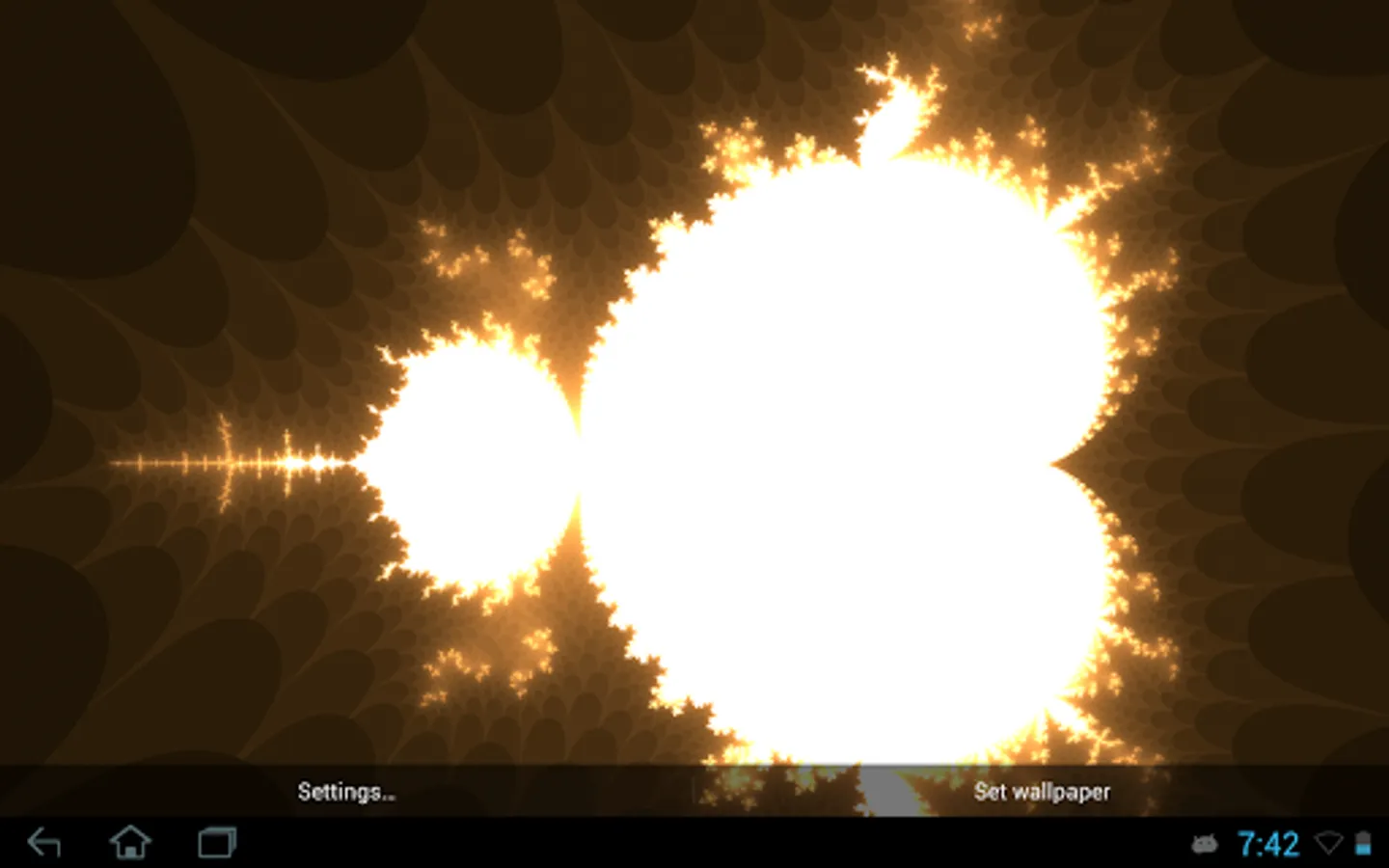 Fractal live wallpaper brings the beautiful combination of mathematics and art on your device. This wallpaper features several high detail rendered fractal set variations. Each fractal set can be additionally configured with animation parameters and color palettes. To get things more exciting, object mapping is also added with some basic lighting, so you can map a fractal set on a plane or sphere and explore other effects like the water or tunnel effect.