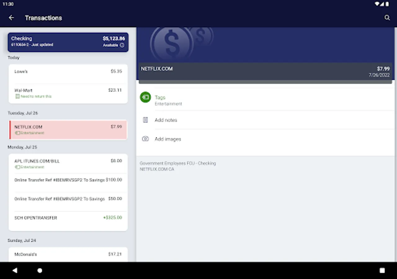 - Keep your transactions organized by allowing you to add tags, notes and photos of receipts and checks.