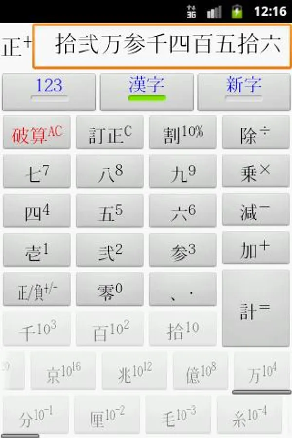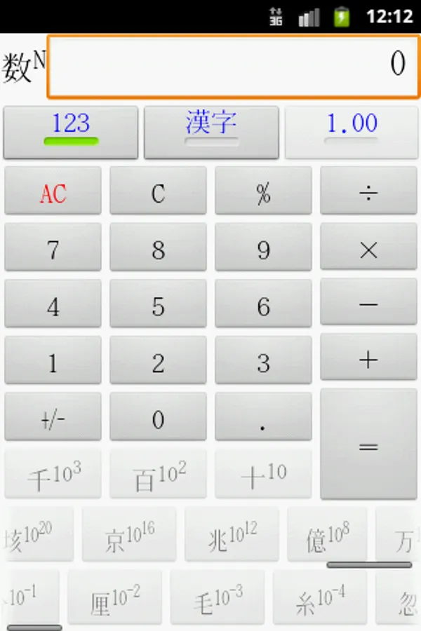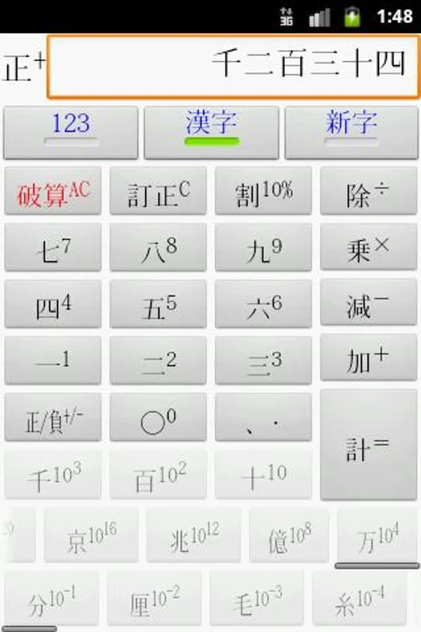 Normaly you can use same as other calcurator. And if you select "Kanji Mode", The numerical result is indicated used by Kanji (Kanji Style is based in Japan).