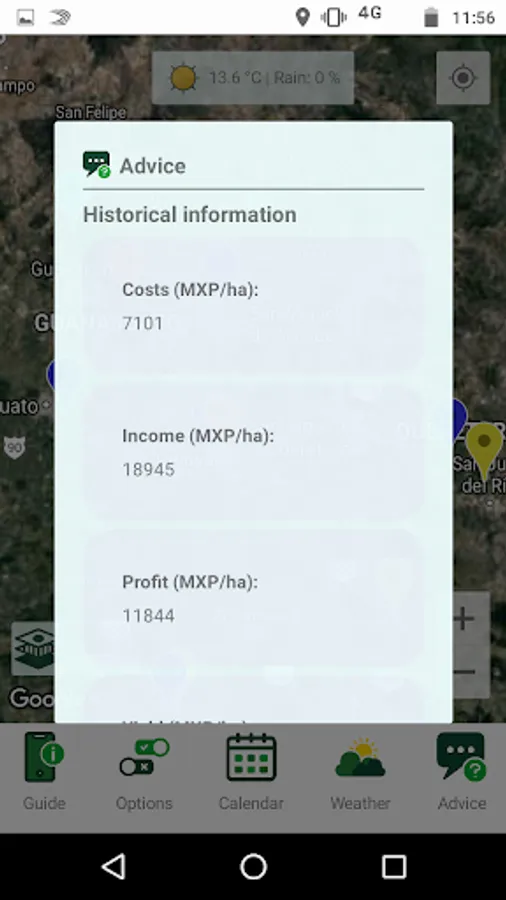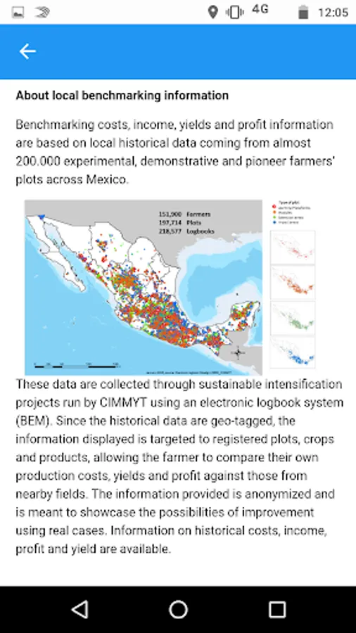 AgroTutor is an application designed for agricultural producers. It provides benchmarking data targeted to the location of your cropping plot. The data includes potential yield, historical costs, agricultural recommendations, weather forecasts and marketing prices. By using AgroTutor you can save your plots, delineate them over satellite imagery, as well as record the activities you perform on them, including agricultural and irrigation management, harvesting, post-harvesting and marketing. At the moment the full set of benchmarking data is available for Guanajuato, Mexico. The application is a pilot project of the International Maize and Wheat Improvement Center (CIMMYT-Mexico) and has been developed by the International Institute for Applied Systems Analysis (IIASA-Austria).