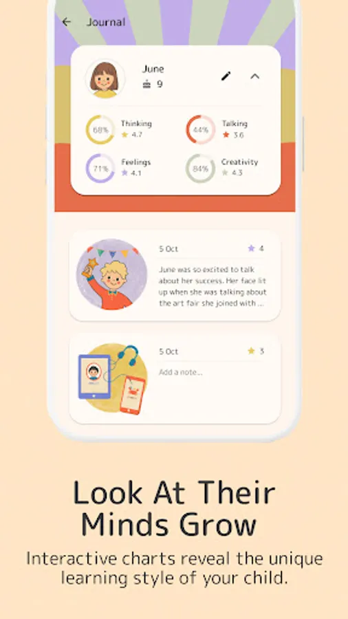 Take a peek at your child's mind as they progress through the four core categories. The interactive charts make it easy to see which categories interest your child the most and reveal their unique learning style. View journals to remember what you've learned together and identify new interests.