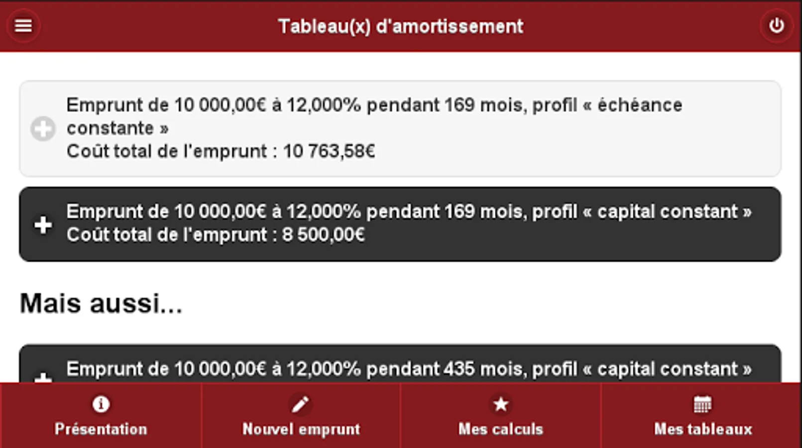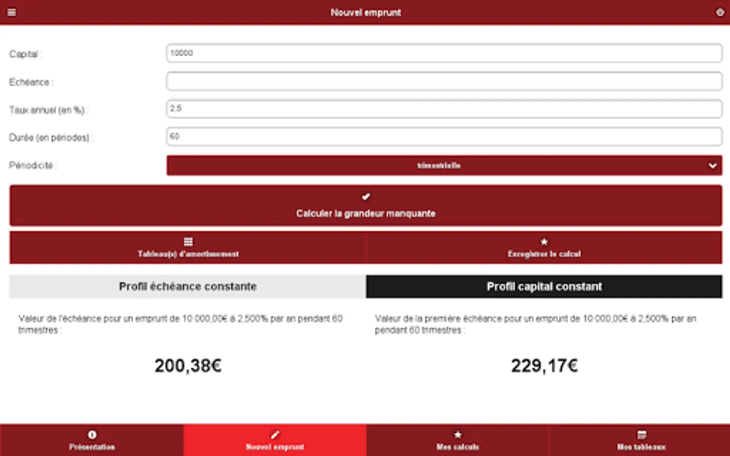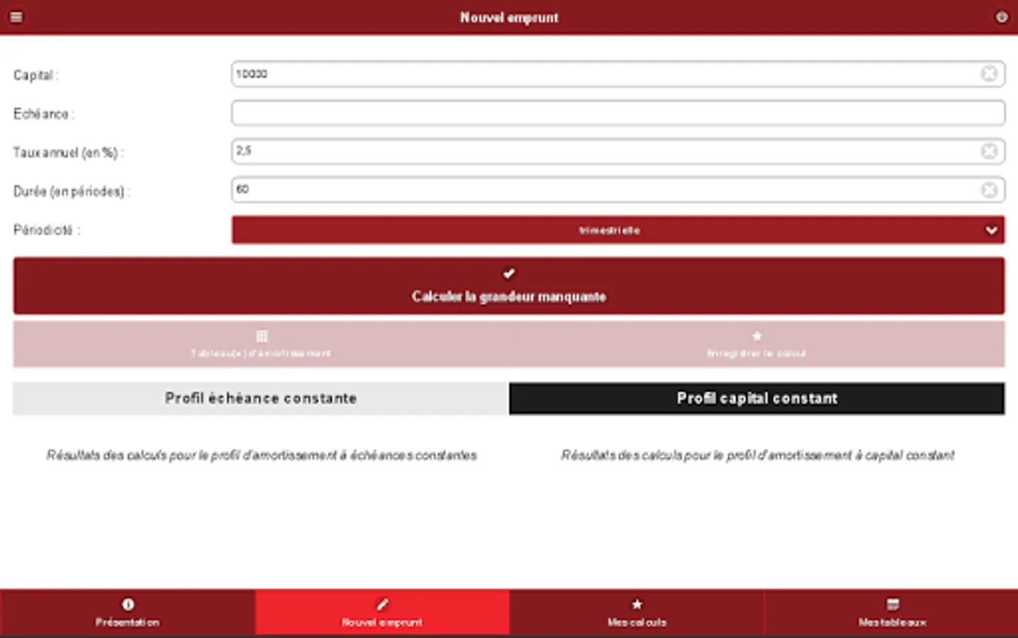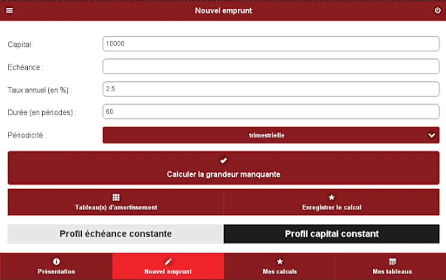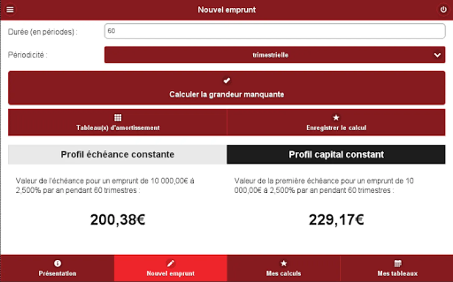 With a simple and intuitive use, it is based on the principle of "calculation of the unknown": the user fills the periodicity of repayment as well as three of the four parameters of the loan (annual rate, maturity, capital, duration) and the simulator calculates the missing parameter, and the tables of depreciation.