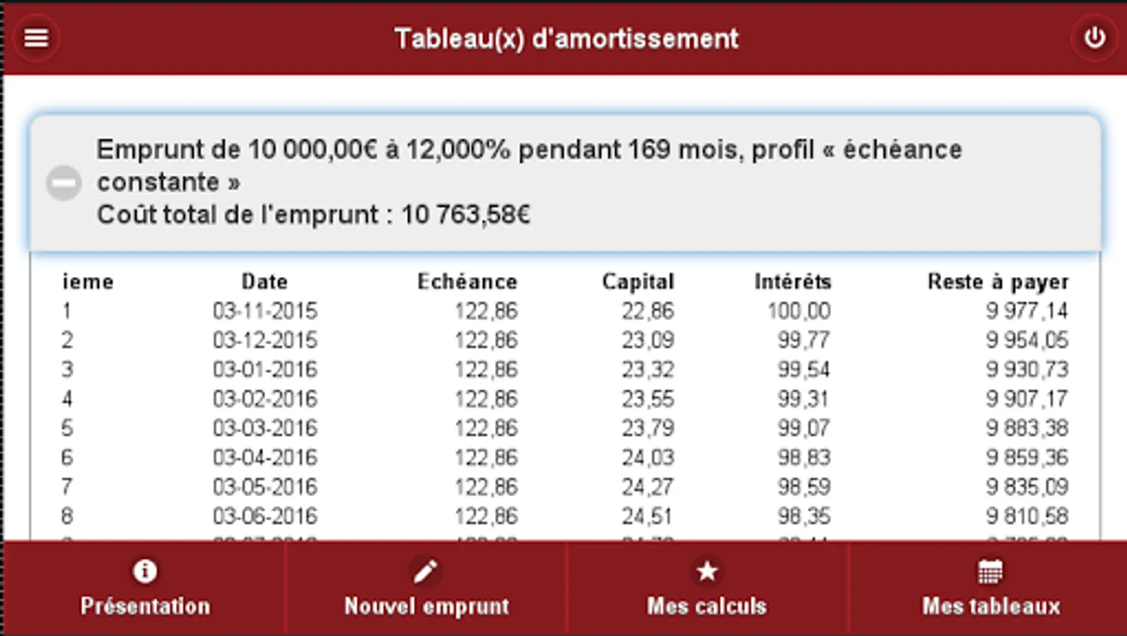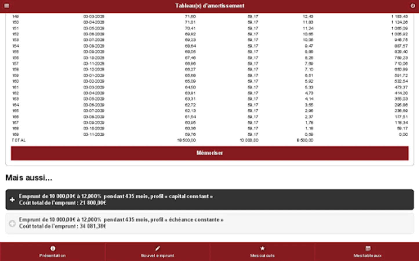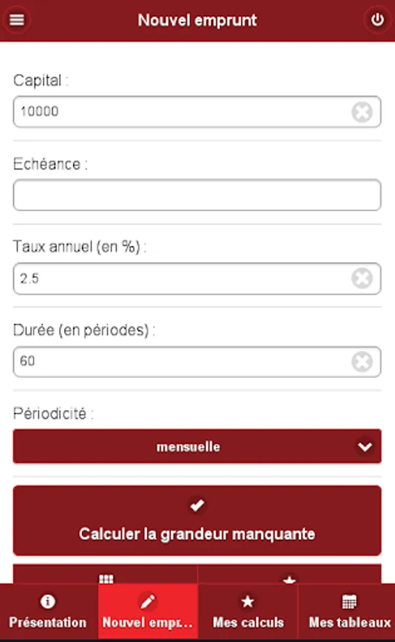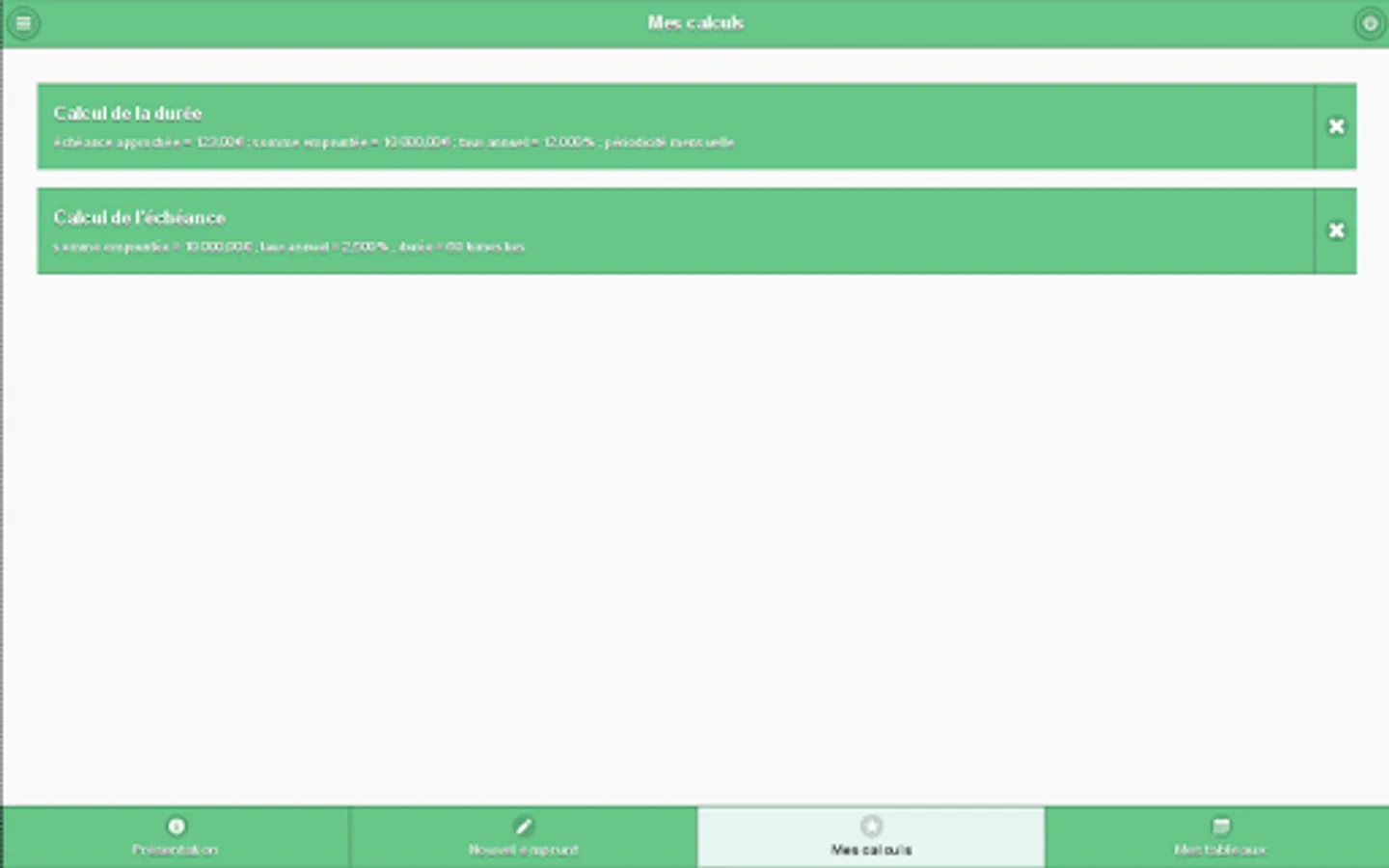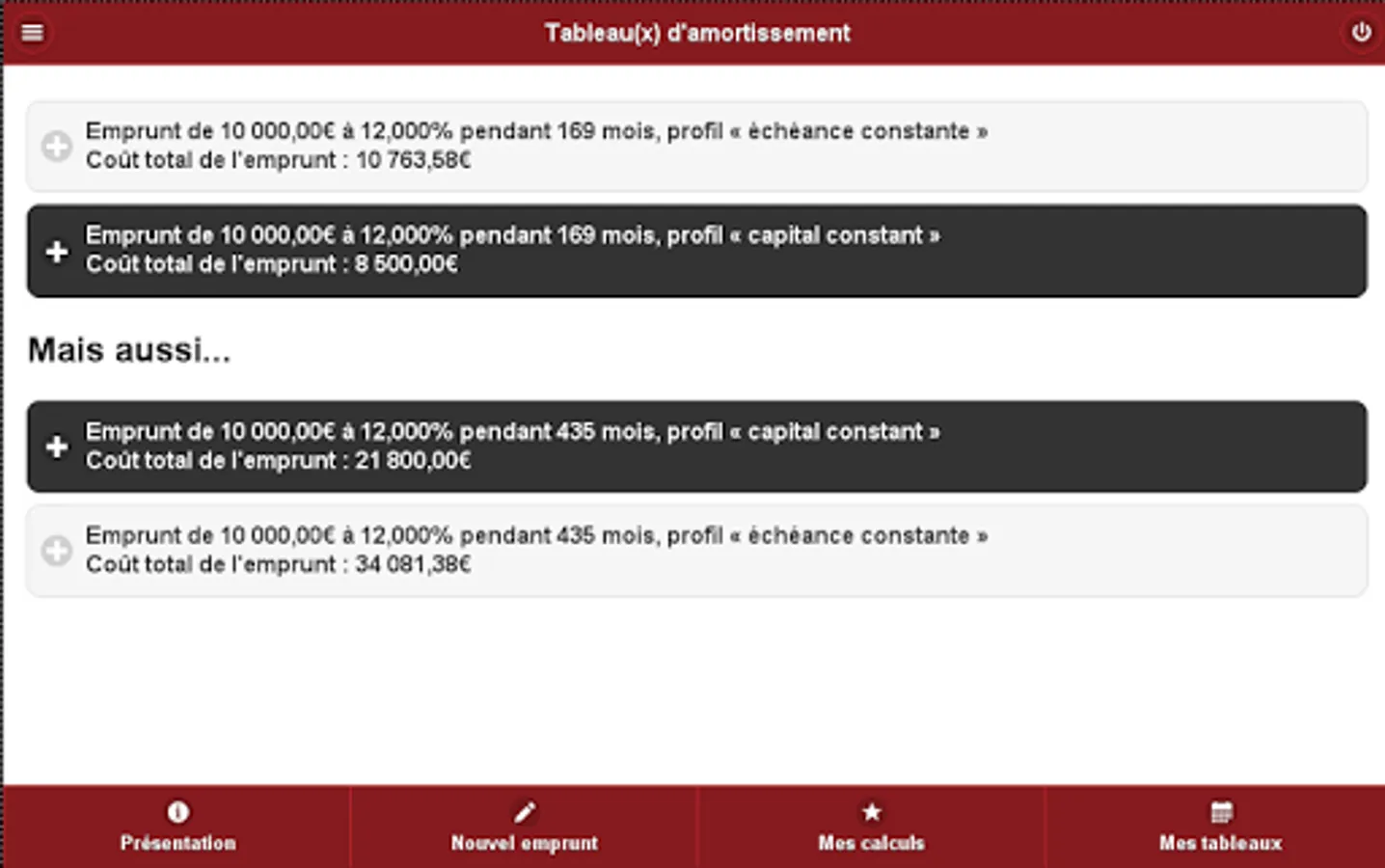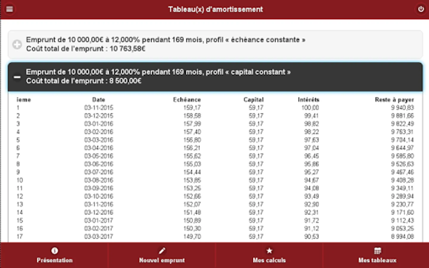 With a simple and intuitive use, it is based on the principle of "calculation of the unknown": the user fills the periodicity of repayment as well as three of the four parameters of the loan (annual rate, maturity, capital, duration) and the simulator calculates the missing parameter, and the tables of depreciation.