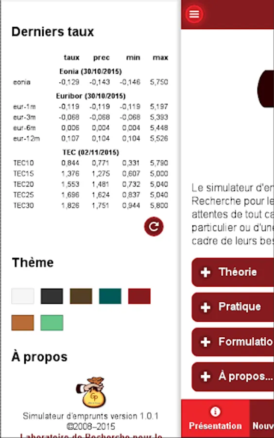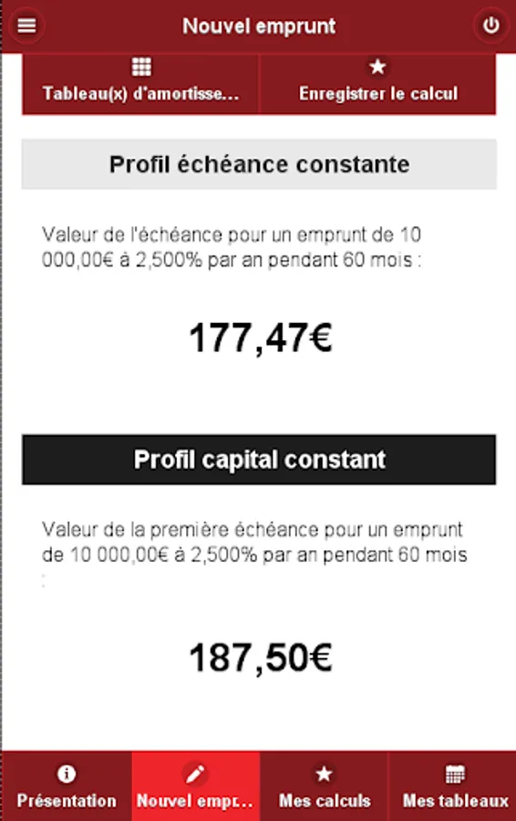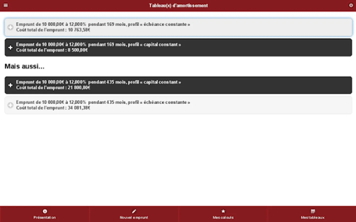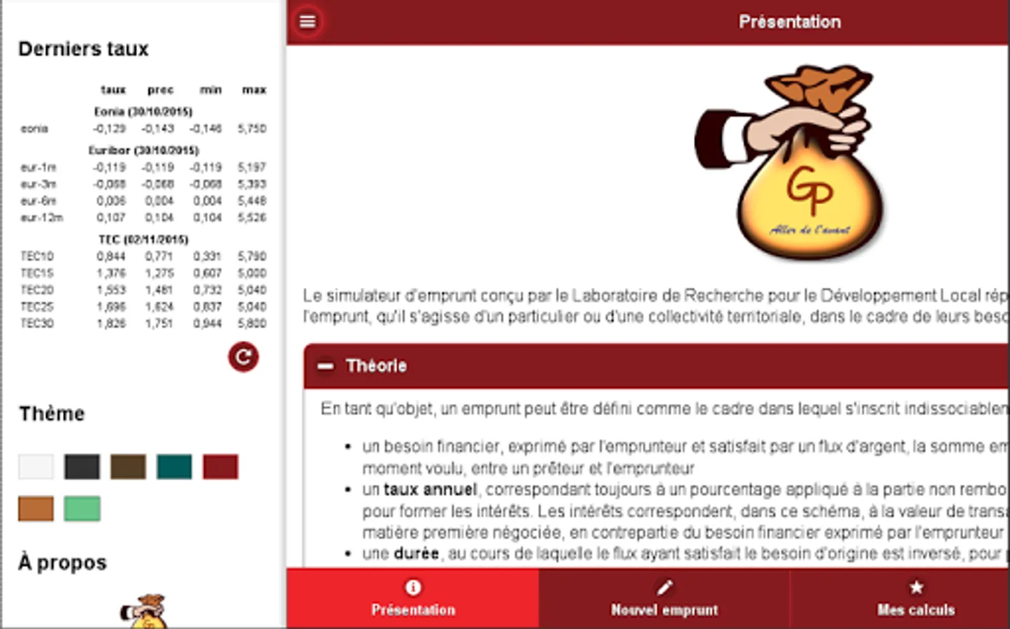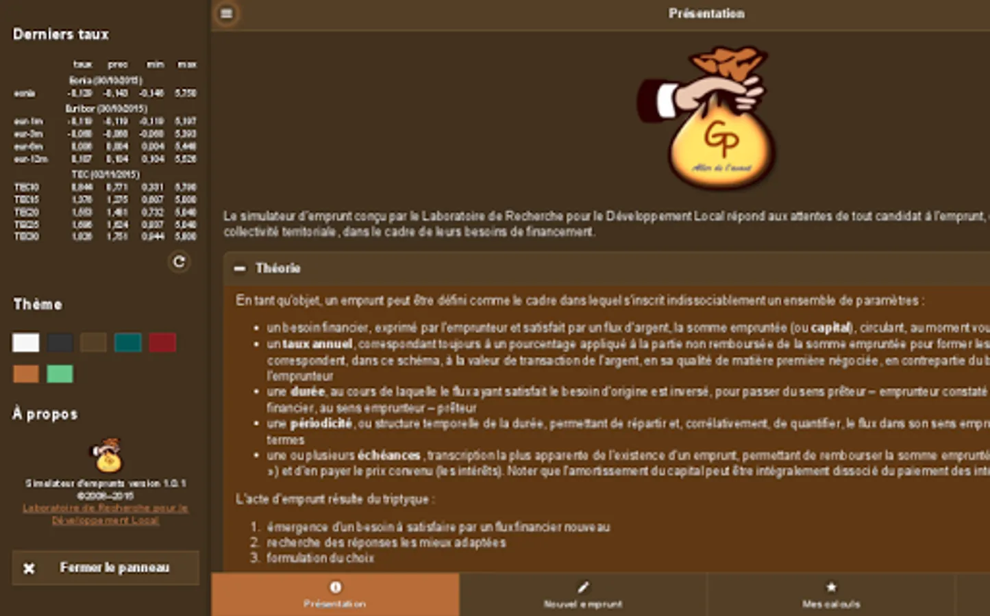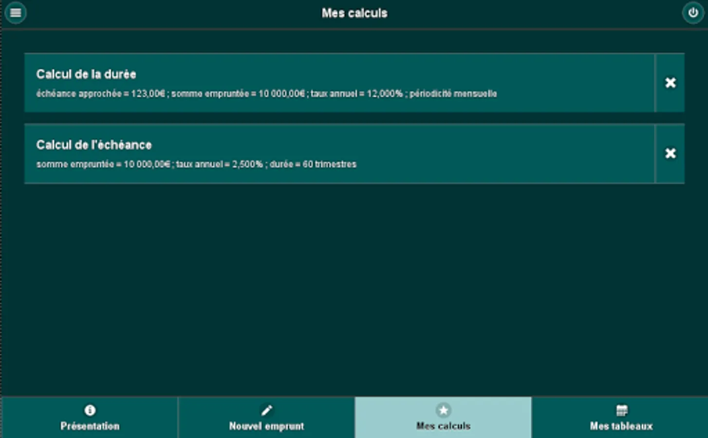 With a simple and intuitive use, it is based on the principle of "calculation of the unknown": the user fills the periodicity of repayment as well as three of the four parameters of the loan (annual rate, maturity, capital, duration) and the simulator calculates the missing parameter, and the tables of depreciation.