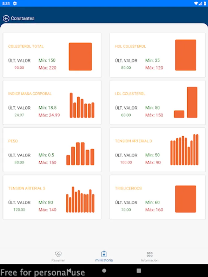 Graph with the evolution of the last values of the main exploration constants (weight, blood pressure, etc.) and essential laboratory values of follow-up (cholesterol, triglycerides and others).