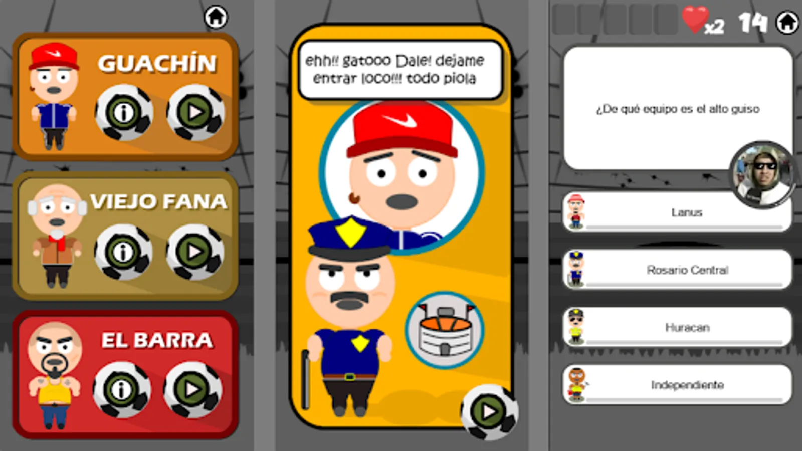 Game of Action, Questions and Answers, Adventure and much more about Argentine soccer, I answered correctly, play the mini-games and help the guachín, the old fana and the bar in their crazy adventures.