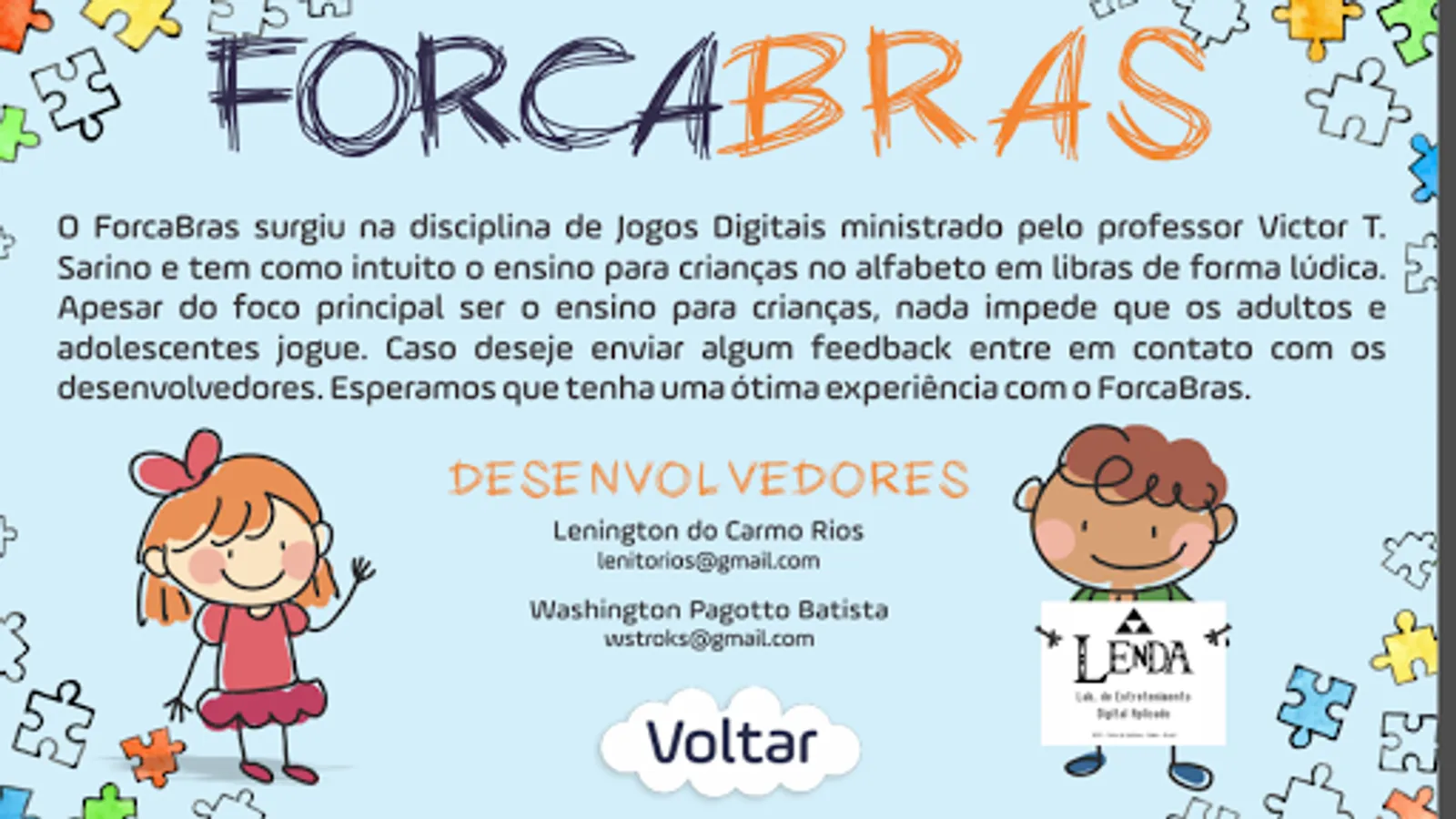 The ForcaBRAS are intended to bring people to the teaching Pounds. This is a game that provides the basis for the start of the study. Based on the game Hangman, the application contains two levels of difficulty: Level Easy (for learning) and Level Difficult (to test the knowledge of the alphabet in Pounds).