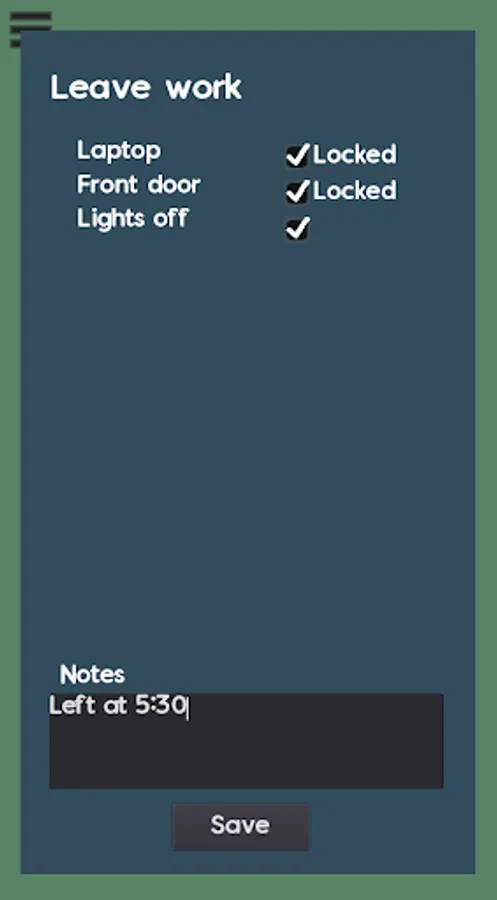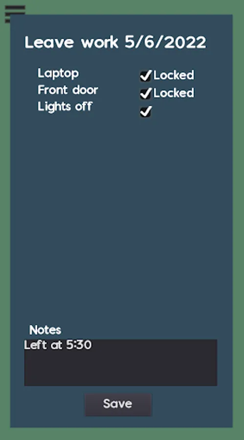 Then start a routine and check off your tasks as you do them. Tap save when you're done and Lock Check will save a time stamped copy of the routine with your notes and the status of each lock and check.