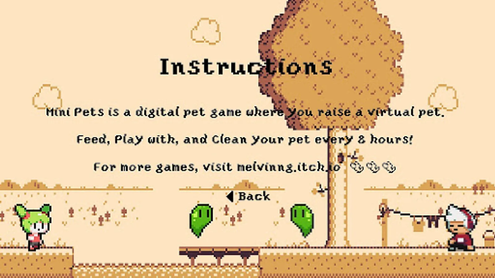 Mini Pets is a digital pet game where you raise a virtual pet by feeding it, playing with it, and cleaning it every 8 hours.
