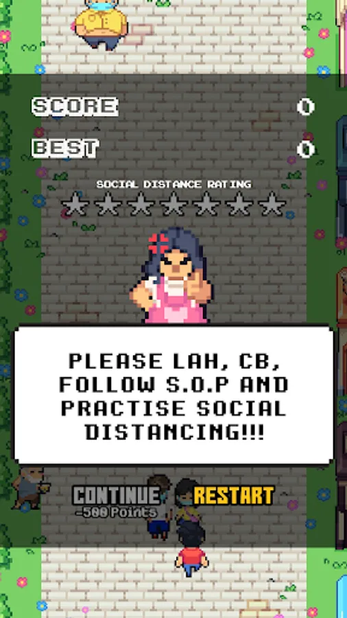 Created by a nobody with zero programming/coding knowledge during a lockdown, Please Lah CB is an endless social distancing runner game (well, sort of endless). Casual, simple and yet extremely challenging. It can be quite a rage game. Try not to give up or destroy your phone!