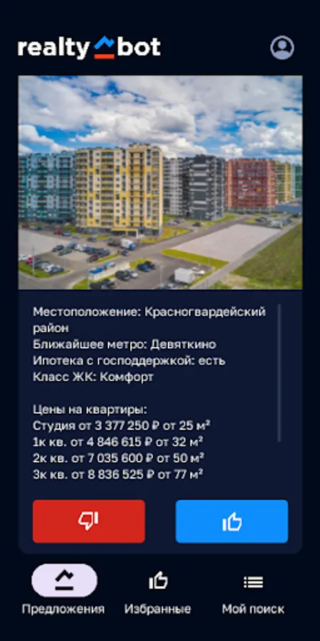 If the offer is not suitable, then you can reject it and continue to receive other options. If you receive a suitable offer, you can accept it and continue to communicate with the realtor. You no longer need to sort through dozens of sites and contact various realtors. All information about available apartments is collected here in the "Realtybot" application. We offer you a choice of many options - from new buildings in Moscow and St. Petersburg to exclusive offers in Dubai.