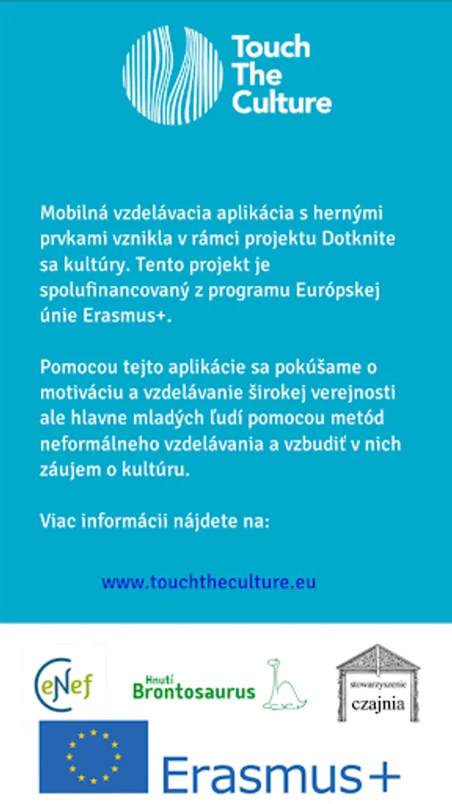 Mobile educational application with game elements. With the help of this application, we try to motivate and educate the general public, but especially young people, using non-formal education methods and to arouse in them an interest in culture.