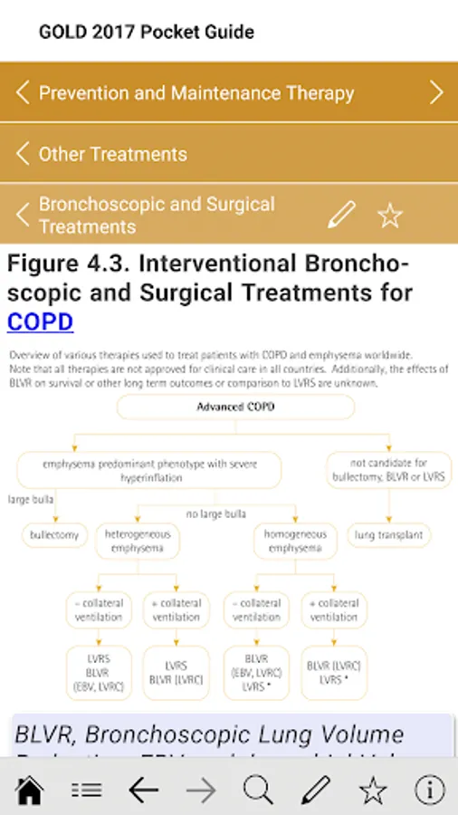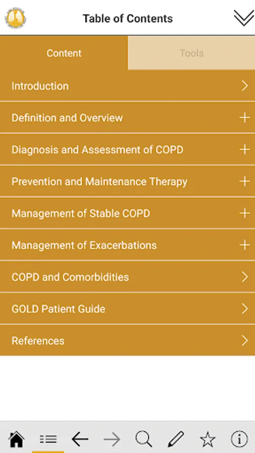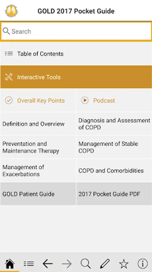 Access the Global Initiative for Chronic Obstructive Lung Disease (GOLD) 2017 Reports at the point of care and use interactive tools such as ABCD assessment tool, mMRC Dyspnea Scale, CAT assessment, treatment algorithm and many more. The app allows users to bookmark important pages and take notes on key information.