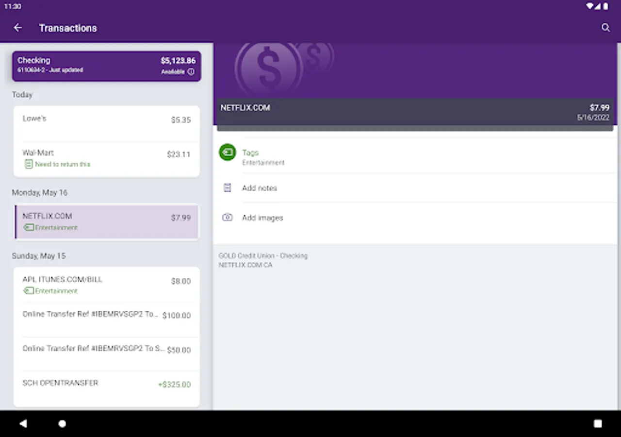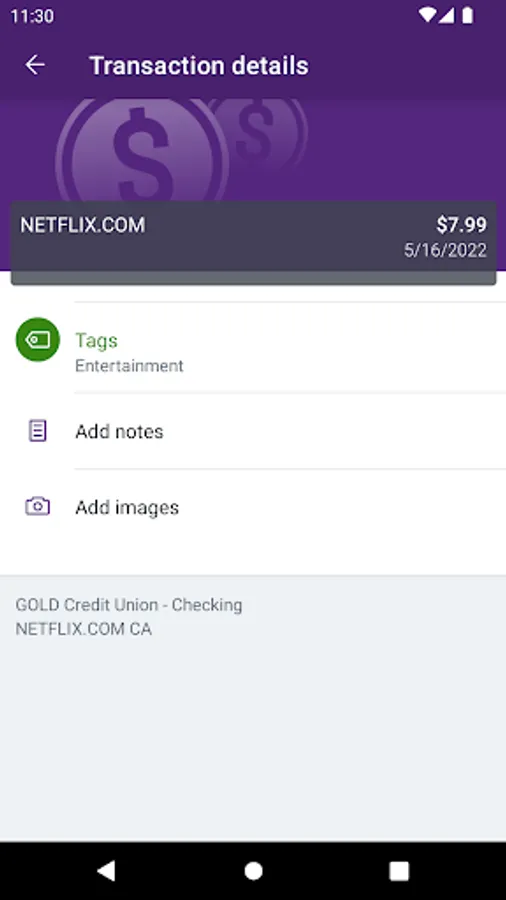 • Keep your transactions organized by adding tags, notes, and photos of receipts and checks.