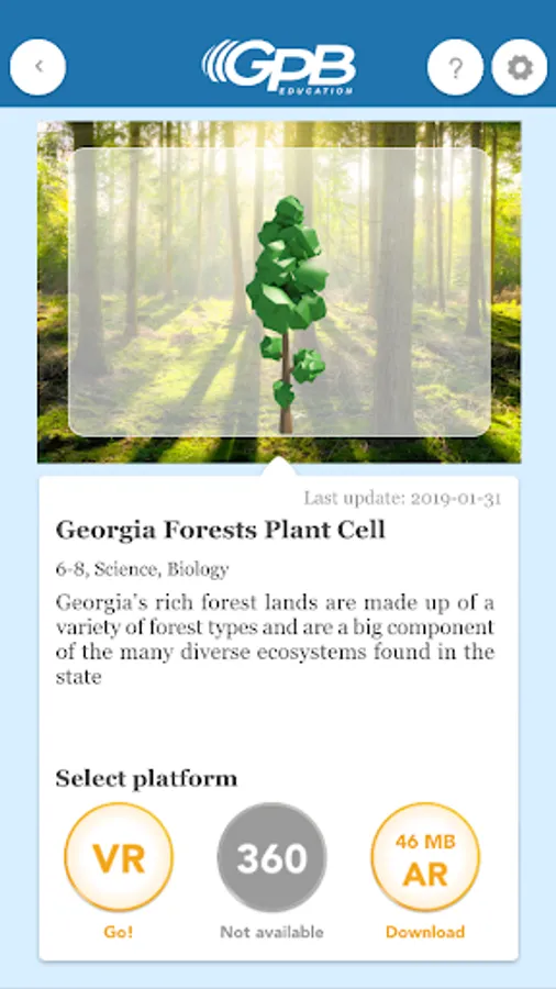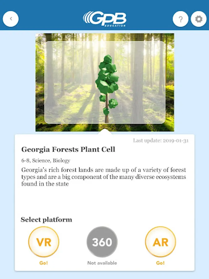 Building on a reputation as a trusted source for educational content, GPB Education is entering a new chapter with virtual and augmented reality. Students can be transported to places and environments without leaving the classroom. These types of experiences also help students make more authentic connections to the content and learning objectives. With a whole new level of immersive learning, this GPB Education VR|AR app allows students to explore the plant and animal cells, as well as sit on stage at the Atlanta Symphony Orchestra while following along with the musicians and conductor.