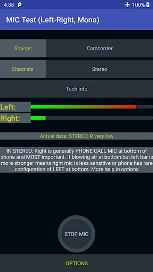 - TEST STEREO: Select source CAMCORDER, channels STEREO then start mic. Blow air at bottom of phone and on rear camera. Check which channel has longer bar. This can help identify which mic is being used as LEFT RIGHT. This also tests sensitivity of MICs.