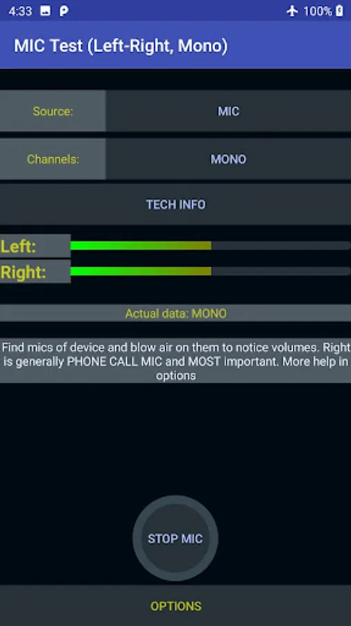 - TEST PHONE CALL MIC: Select source MIC and channels MONO then start MIC. Blow air at bottom of phone. Some devices may also use more than 1 mics for filtering purposes.