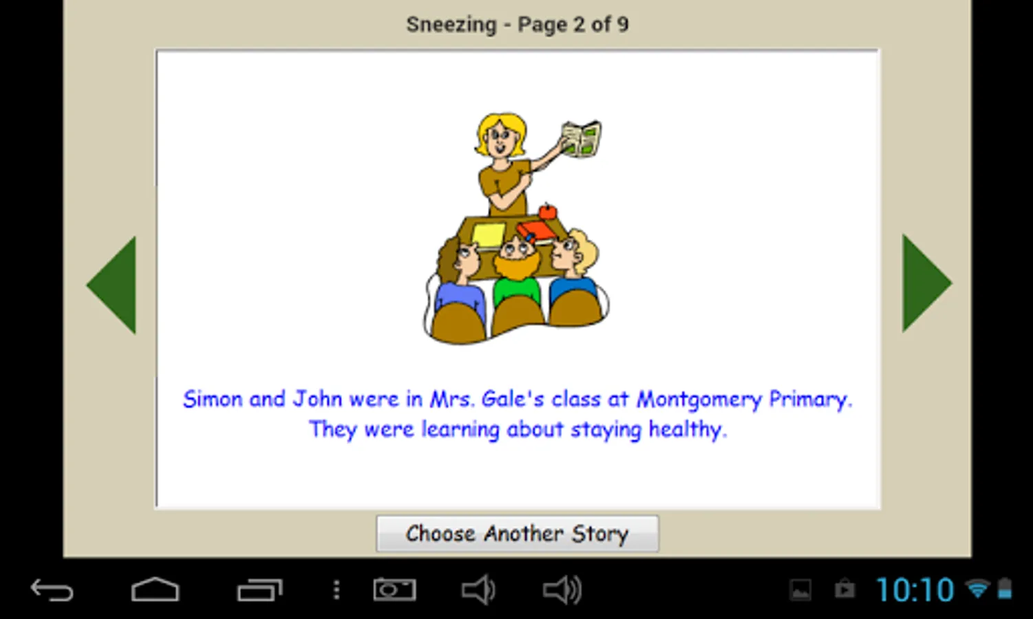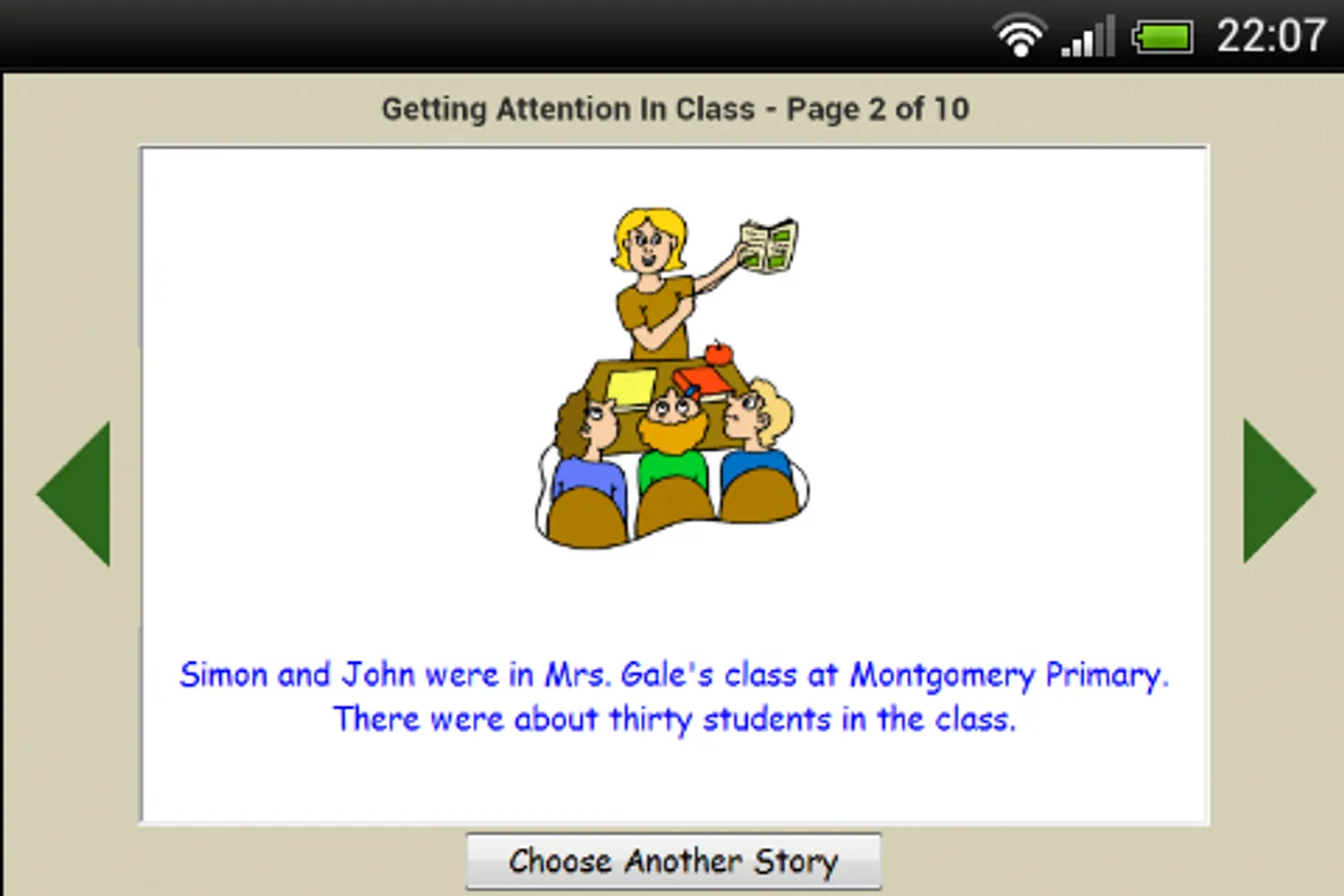 Simple stories with pictures to help children learn some basic life skills. They can allow them to overcome their fears or complete tasks which they need help understanding. This program contains a number of Social Stories with illustrations. They have been written by Grey Olltwit, are completely new and are not available anywhere else. Social stories included are; Getting Attention In Class, Dirty Hands, Sneezing, Looking Where You Are Going, Good Conversation, Playing With Friends, Turn It Down and Waiting Your Turn. Can be played landscape on a phone but best played on a tablet.