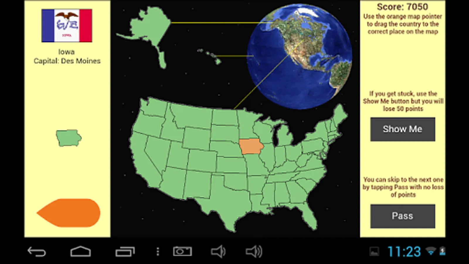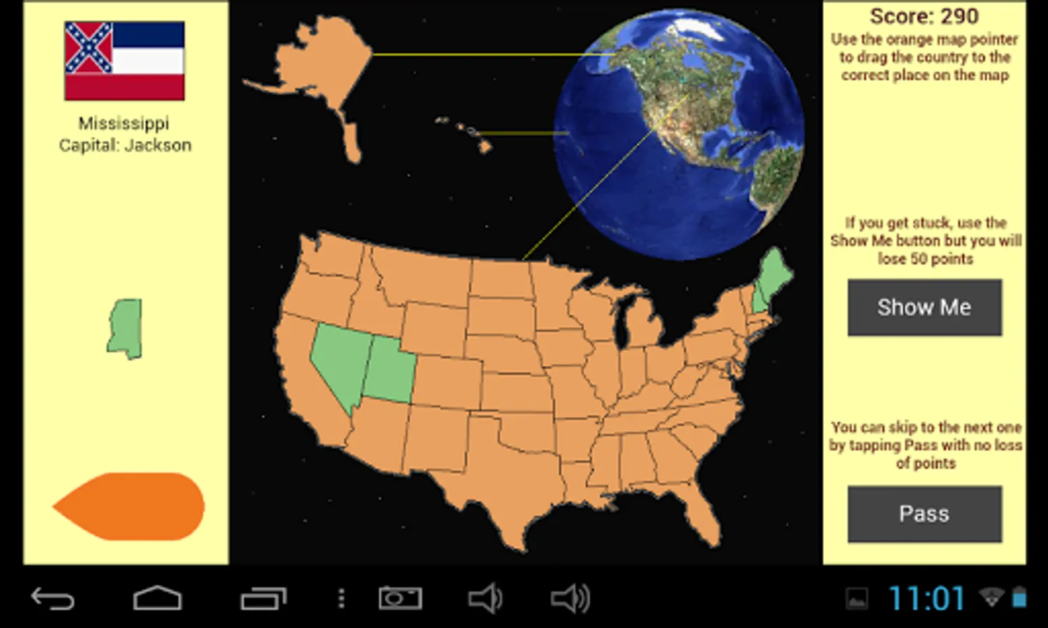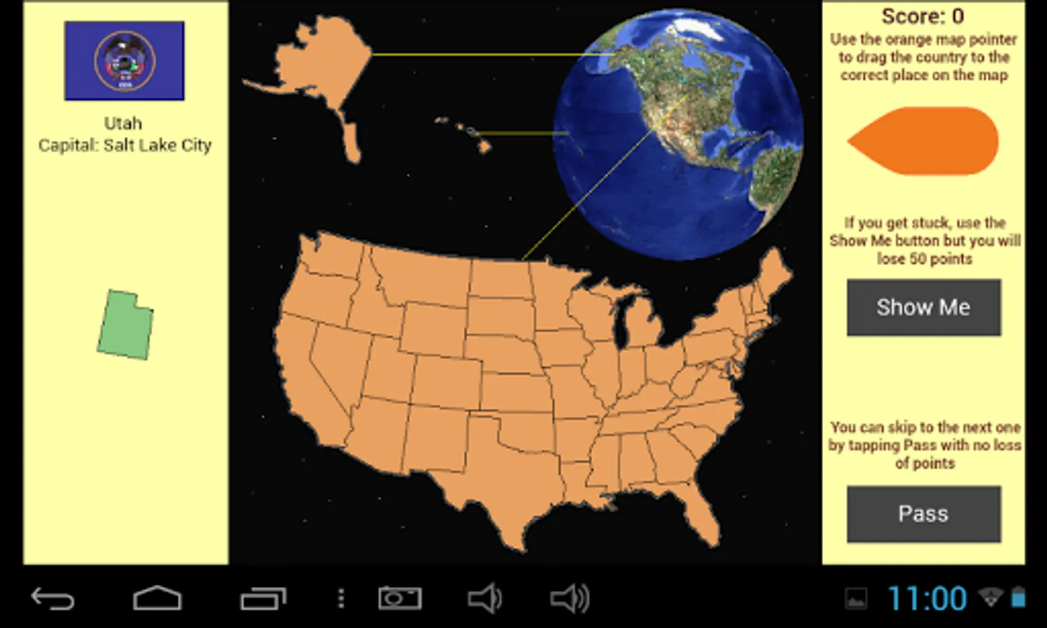 Click the Play or Play Advanced Version button on the first screen to start. You will then be shown a blank map of the United States of America. In ordinary Play mode, the borders of the states are shown. In the advanced mode the state borders are not shown and you gain more points for each correct answer. To play, choose one of the two buttons that appear when the program is loaded.