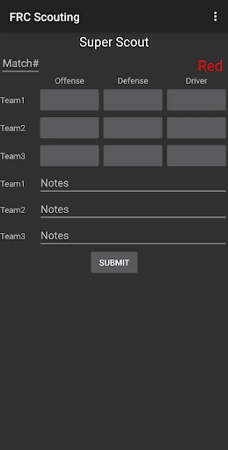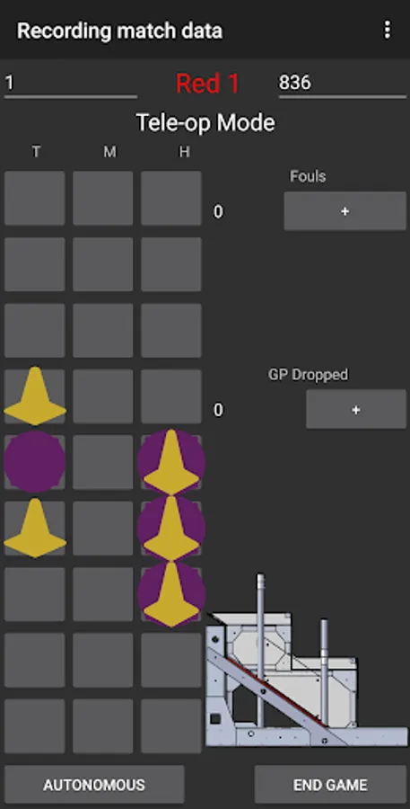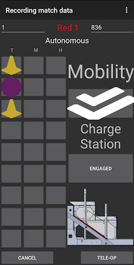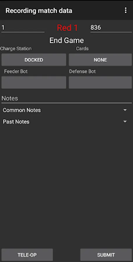 This app allows team members watching qualification matches at competitions to record data about the robots. Intended use is for 6 people on a team to watch each match, each one recording data about a single robot. At the beginning of the competition, each device can be assigned a position, and once a match number is entered, the appropriate team numbers will fill in if there is a valid match schedule posted.