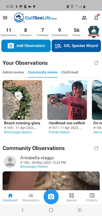 GulfSeeLife provides instant access to natural history information for the most common plant and animal species found on the northern coast of the Gulf of Mexico, including dune plants and seaweeds, fishes, birds, marine and land mammals, and invertebrates such as jellyfish, crabs and shells. Users can share their observations of wild species with the GulfSeeLife community by uploading photos and videos. The ID Wizard feature helps users to identify which species they have observed, and then other users weigh-in on species identification by voting. Users can use filtering and mapping to track where and when their favorite wildlife have been observed by the community. GulfSeeLife creates a community around our shared appreciation for the Gulf's natural resources. Educators can build lesson plans around GulfSeeLife content and learners of all ages can contribute to the species observations data base. Scientists and community members can also set up citizen science projects to crowd-source data collection to improve our understanding and management of the Gulf.