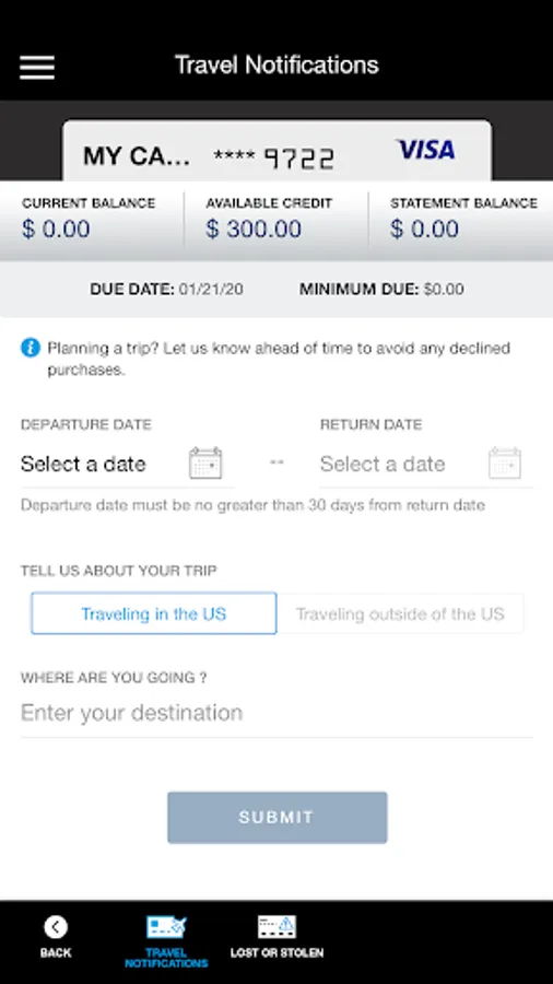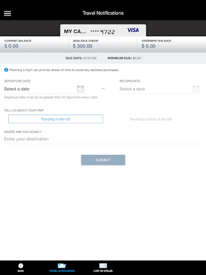 • Set your own travel notifications- don’t have your card denied for out of town purchases, set it and forget it