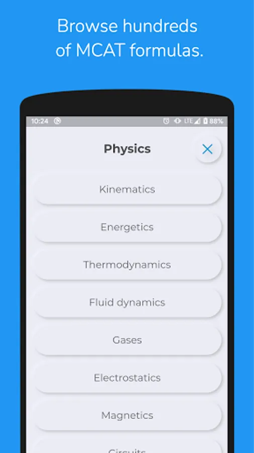 3) Learn Formulas: A Duolingo-style interface to memorize MCAT-relevant formulas. Practice variables, words, multiple-choice, or fill-in-the-blank, and ensure you don't misremember any formulas on Test Day.