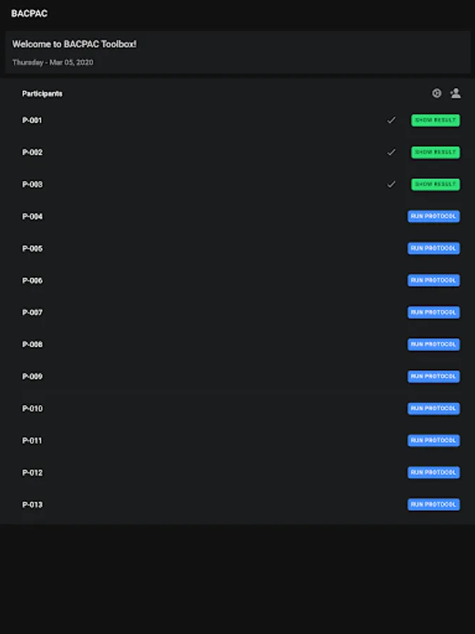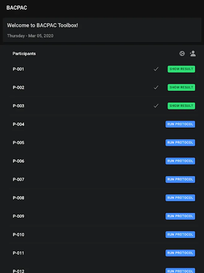 BACPAC Toolbox is an app for physicians to run sets of protocols designed for BACPAC study