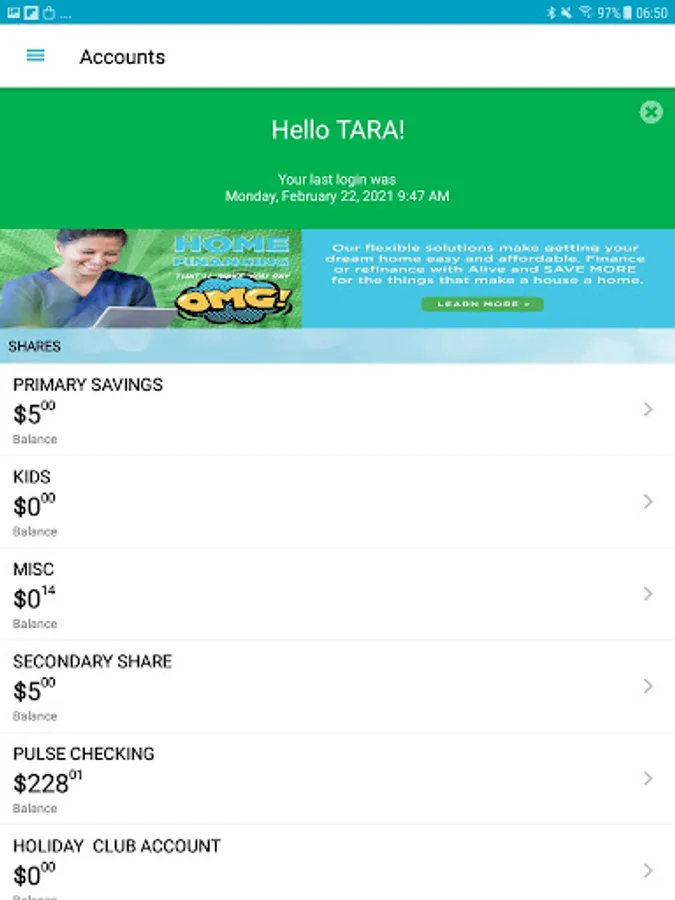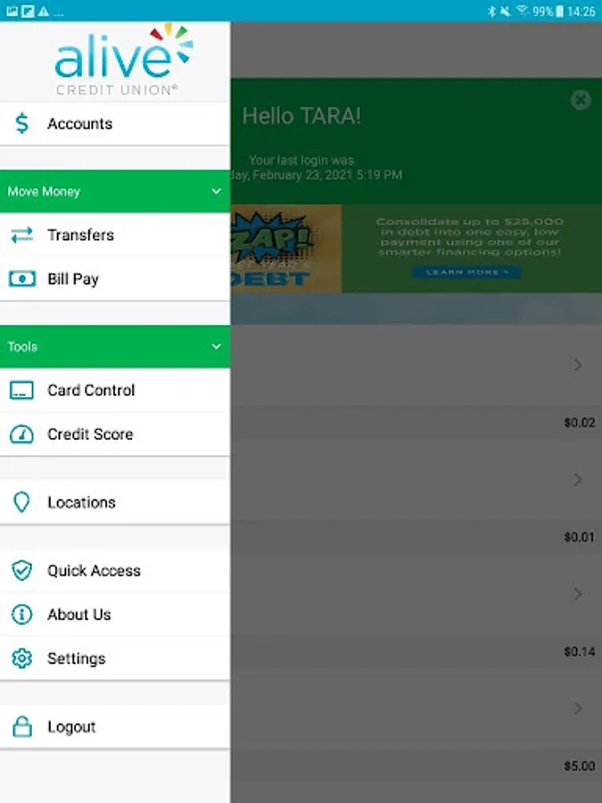 Log in safe and secure with touch ID, manage your accounts, make quick transfers, deposit checks, view checks, pay bills, receive alerts and find the closest ATM in the Alive network.