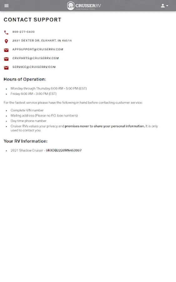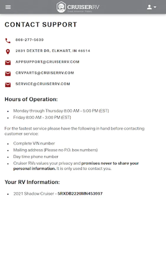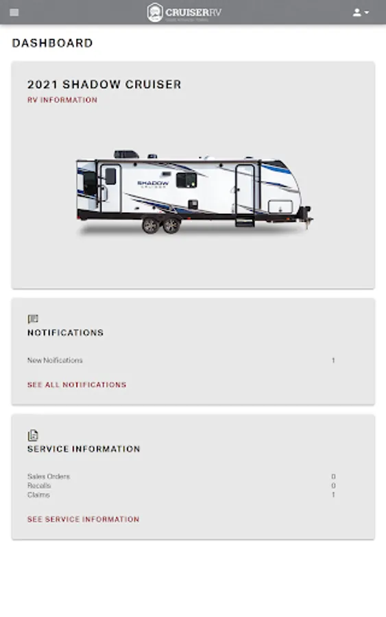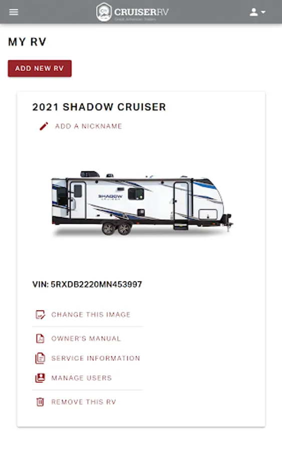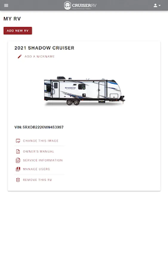 i) Add your RV model, make and VIN. This will link to your warranty information and status, sales orders, your claims as well as any recalls pertaining to your RV. You can also manage users by inviting others to see your unit information.
