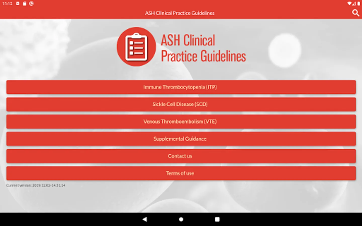 The ASH Practice Guidelines app provides easy access to every recommendation from all guidelines published by the American Society of Hematology (ASH), including rational for each recommendation and benefits and harms associated with each recommended course of action. The app currently includes guidelines covering venous thromboembolism (VTE), sickle cell anemia (SCD), and immune thrombocytopenia (ITP). The app also provides access to other tools and resources designed to aid in clinical decision-making, including links to the published guideline manuscripts, ASH Choosing Wisely lists, the ASH Consult a Colleague program, and the ASH Pocket Guides app.
