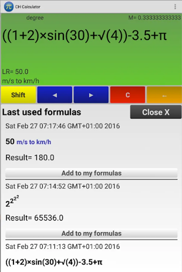 The complete formula can be entered on one line. Big multiline display for overview of all relevant informations.