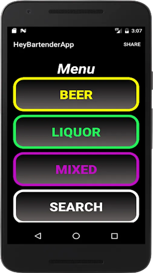 Our mission was to create a simple, quick, and easy interface to maximize your time of having fun. Big buttons along with clear pictures makes it easy to find what you’re looking for in a maximum 3 screens. Simplicity is what Hey Bartender App is all about.