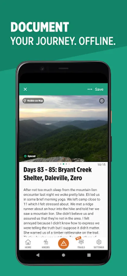 - Document your hike OFFLINE with journals, photos, distance tracking