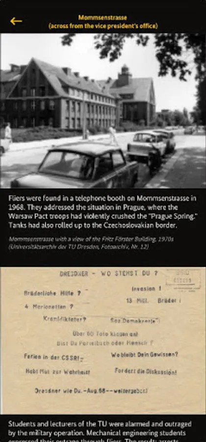 The histocaches contain stories from the files of the Stasi, associated with buildings and places on the campus of TU Dresden. The app provides insights into these files ‒ outside the Archives, at the scene where they happened. Augmented reality revives the historic views of these places.