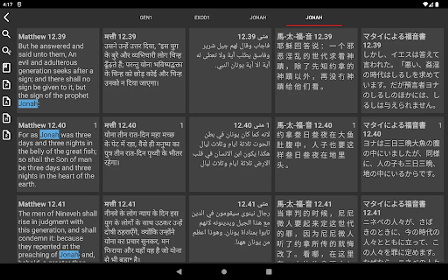 Bibles included: King James Version, Louis Segond, Ostervald, Diodati, Reina Valera, Almeida, Schlachter, Arabic Bible (Smith & Van Dyke), Hindi Bible, Chinese Bible (Chinese Union Version Simplified), Japanese Bible (New Japanese Bible 1973), Russian Bible (Russian Synodal Translation 1876).