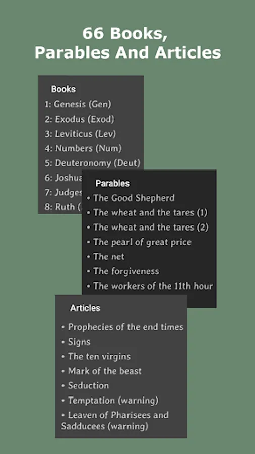 Easy to use with quick search and share, plans of reading, audio Bible, articles, cross-references, harmony of Gospels, random verses.