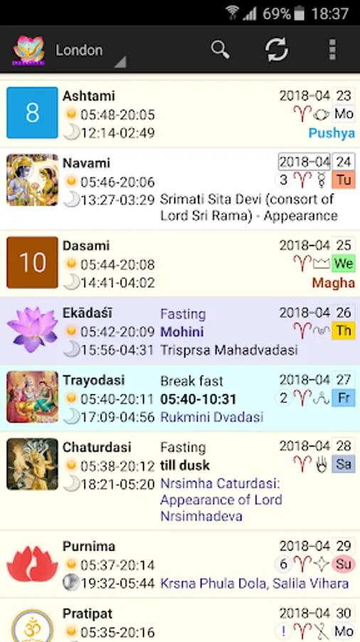 The App calculates Shuddha Ekadashi, Tithis and Nakshatras, Sunrise and Sunset timings as well Moon timings potentially for all places in the world.