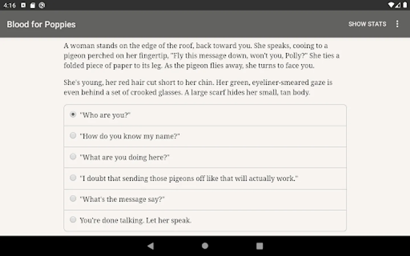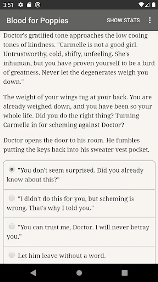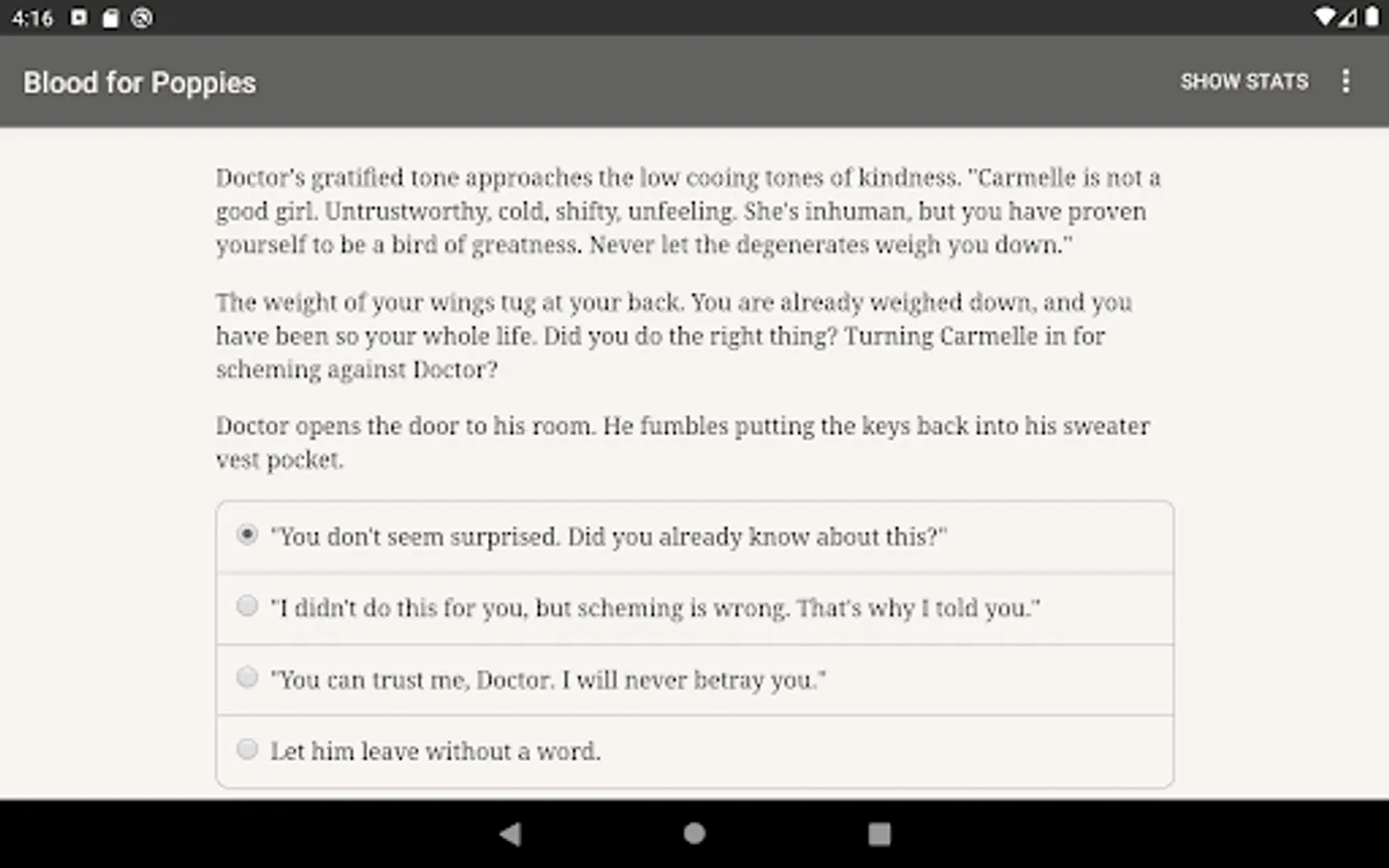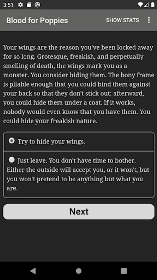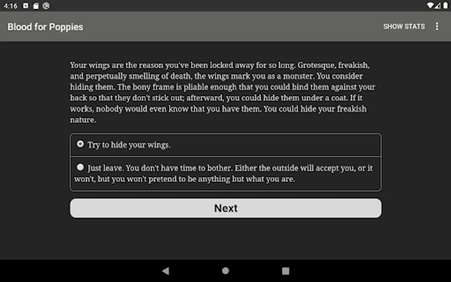 Blood for Poppies is a 188,000-word psychological horror interactive novel by M.E. Smith about entrapment and the lingering effects of trauma. It's entirely text-based, without graphics or sound effects, and fueled by the vast, unstoppable power of your imagination.