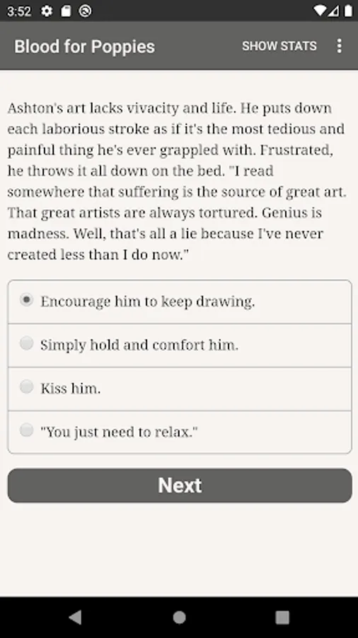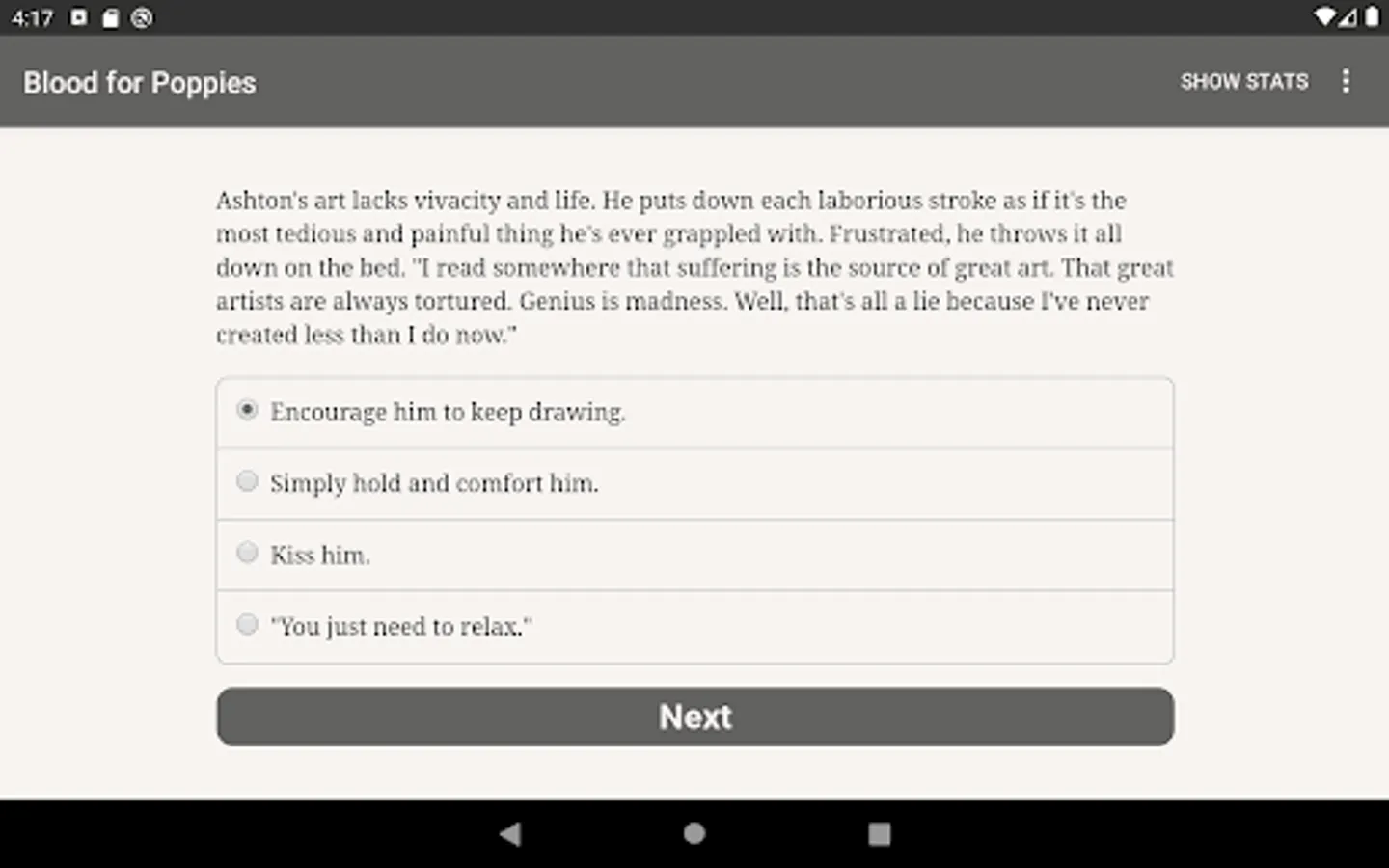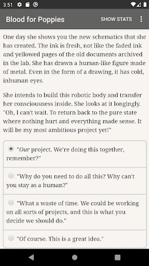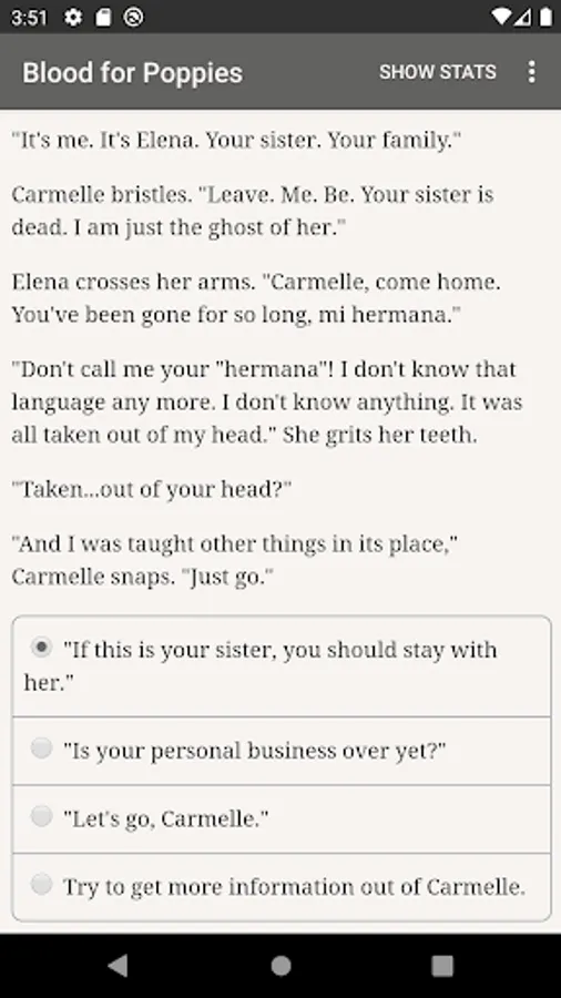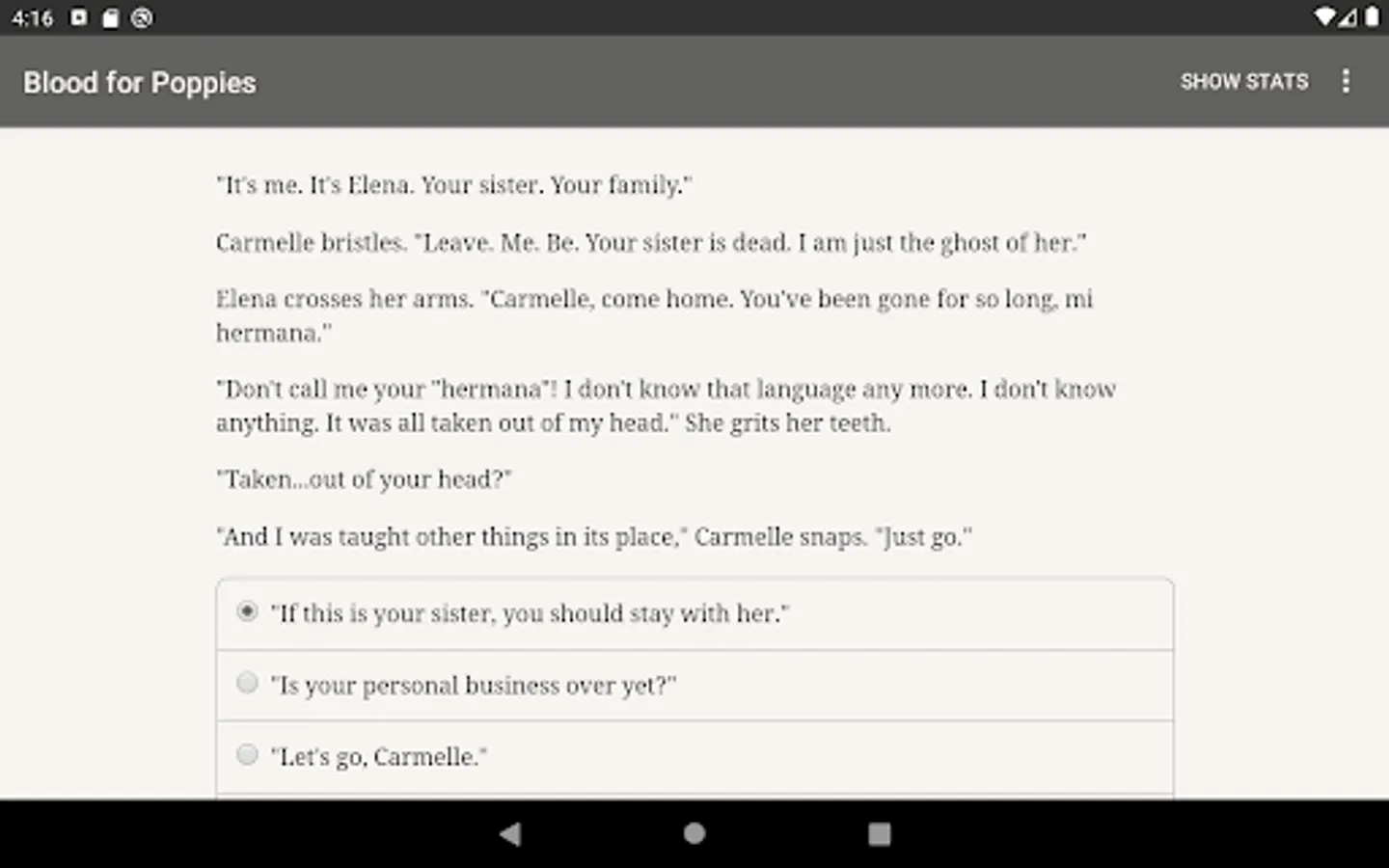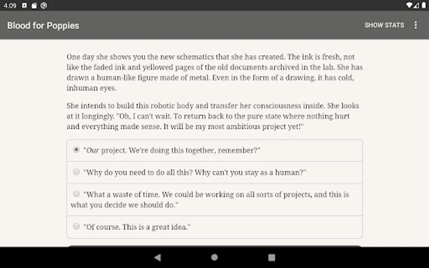 Blood for Poppies is a 188,000-word psychological horror interactive novel by M.E. Smith about entrapment and the lingering effects of trauma. It's entirely text-based, without graphics or sound effects, and fueled by the vast, unstoppable power of your imagination.