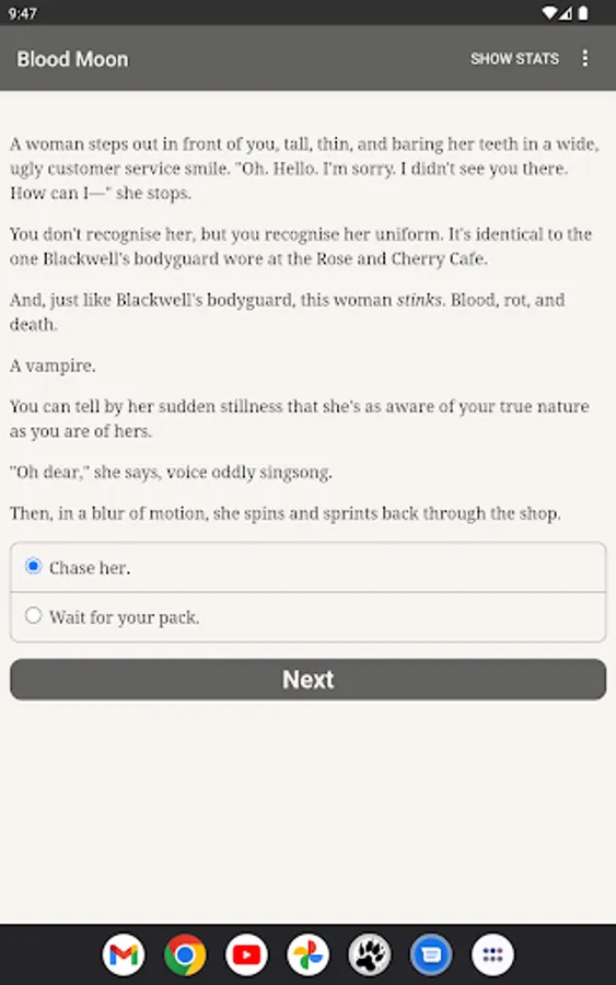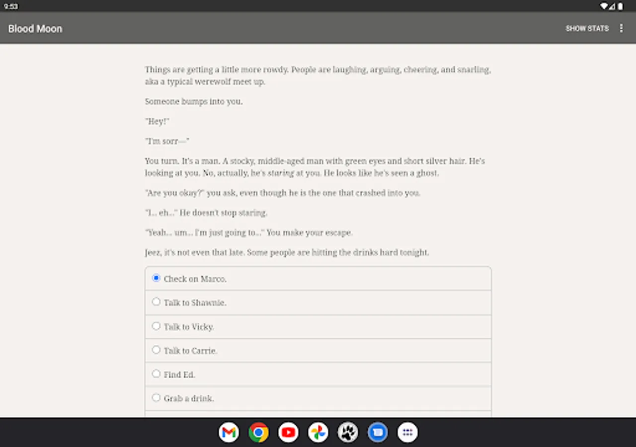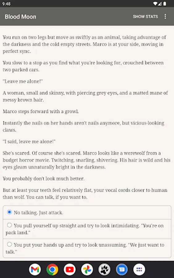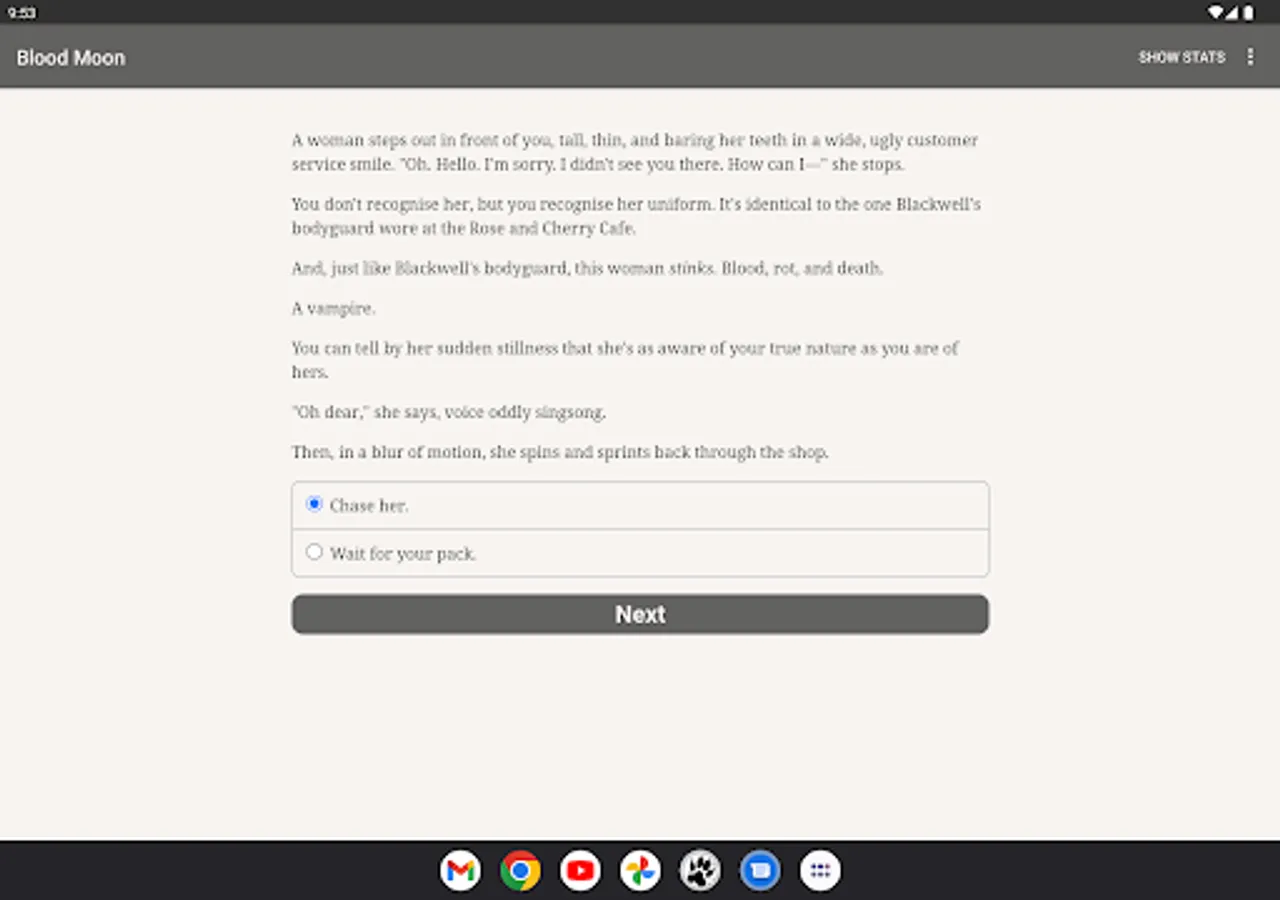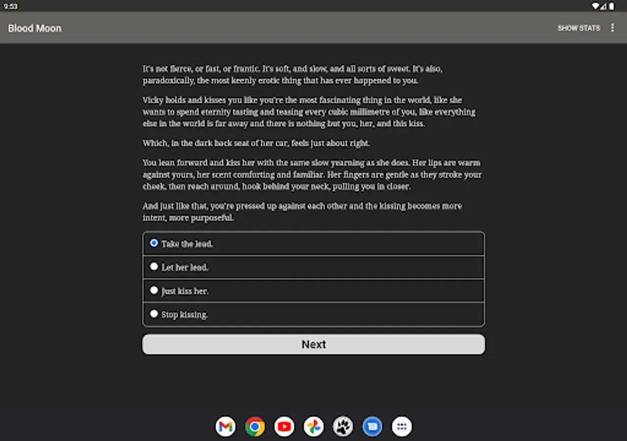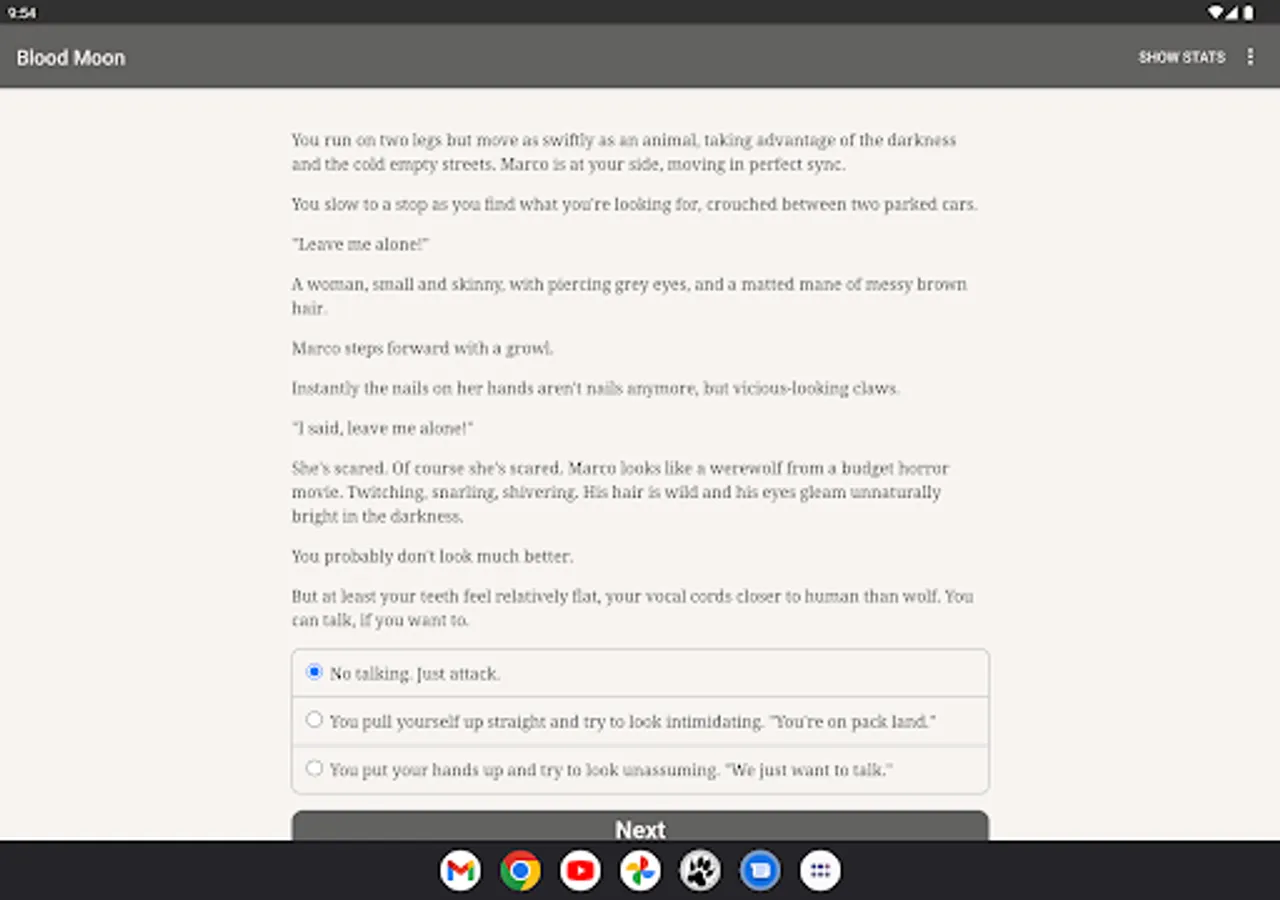 "Blood Moon" is a 445,000 word interactive novel by Barbara Truelove. It’s entirely text-based, without graphics or sound effects, and fueled by the vast, unstoppable power of your imagination.