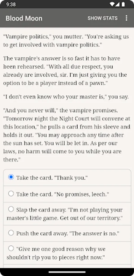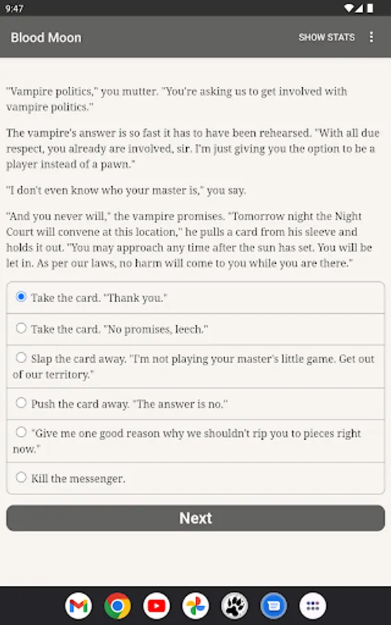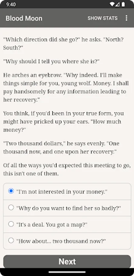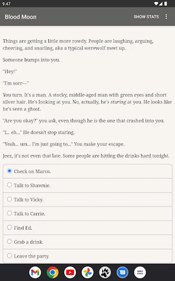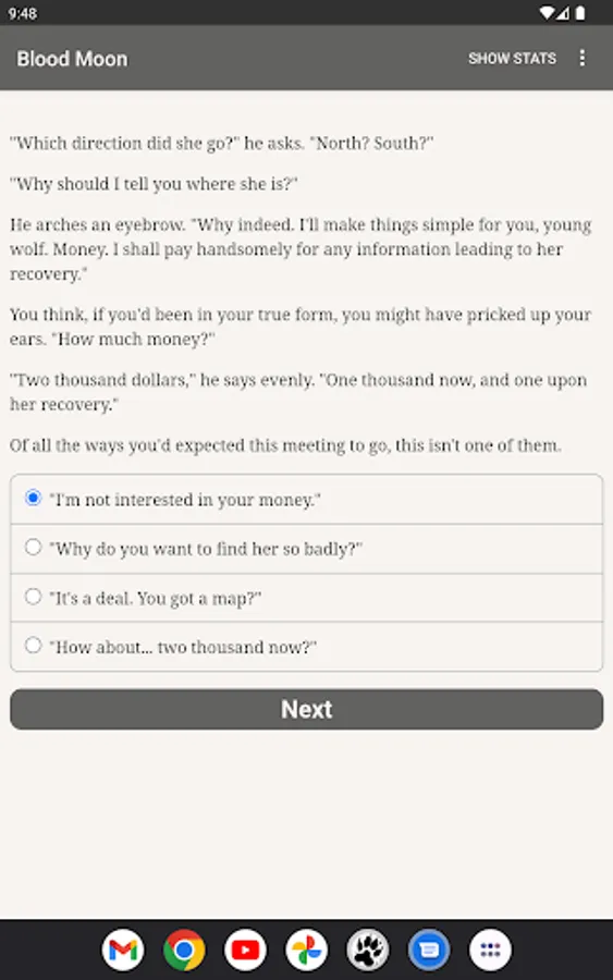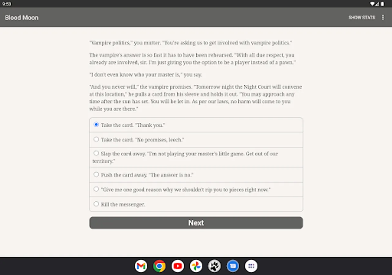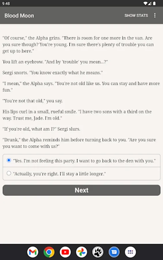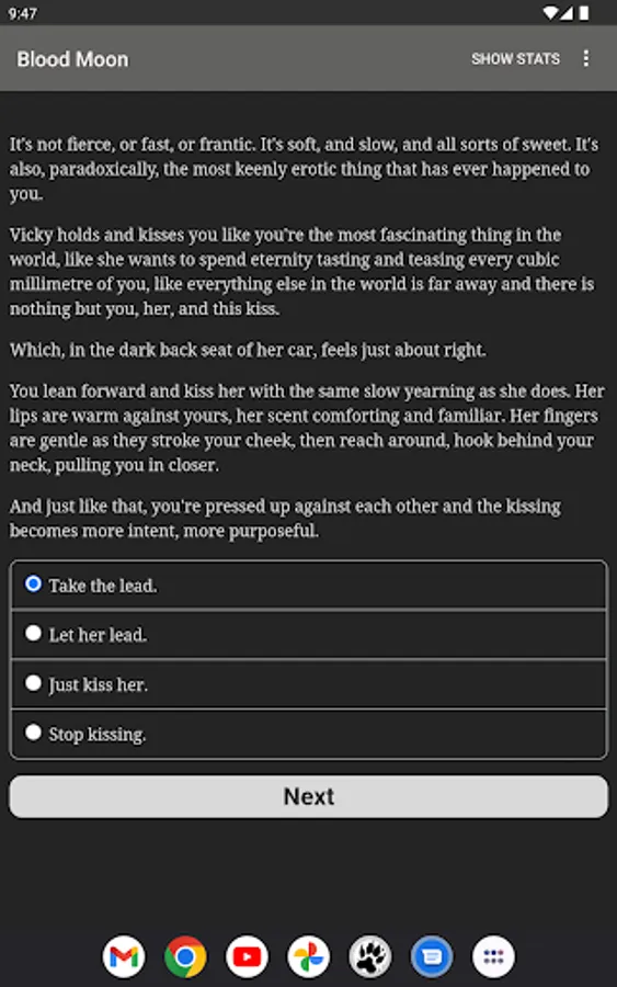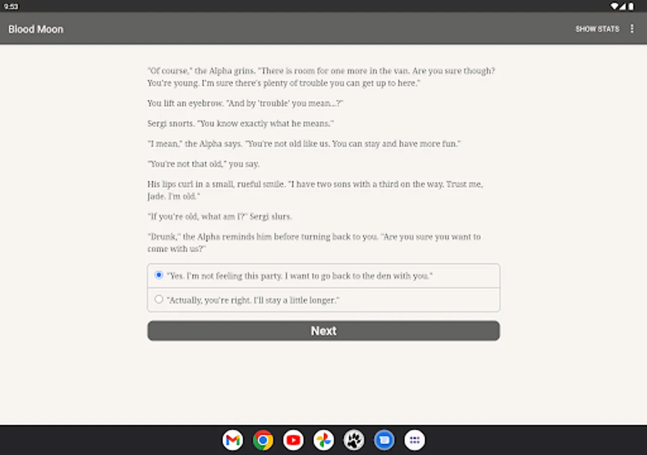 "Blood Moon" is a 445,000 word interactive novel by Barbara Truelove. It’s entirely text-based, without graphics or sound effects, and fueled by the vast, unstoppable power of your imagination.