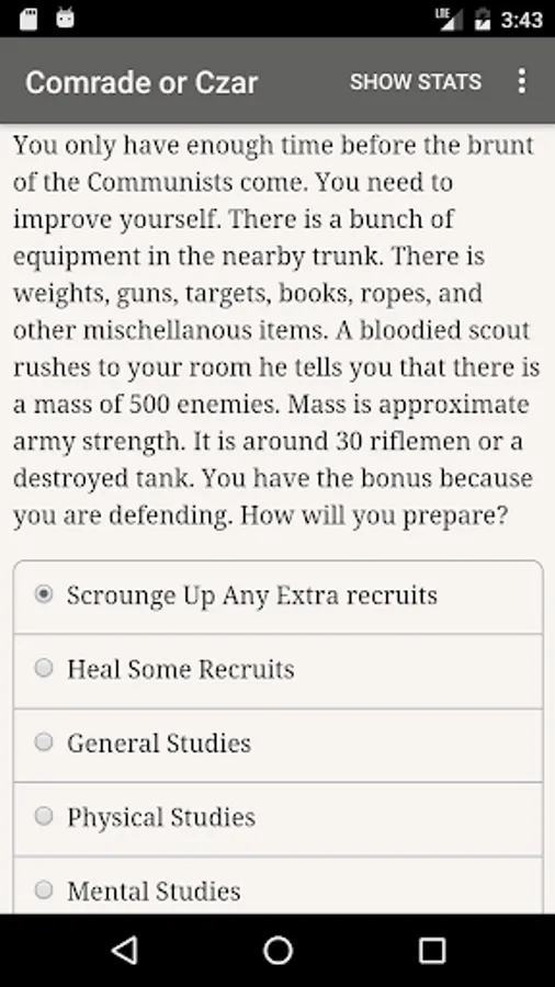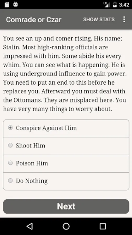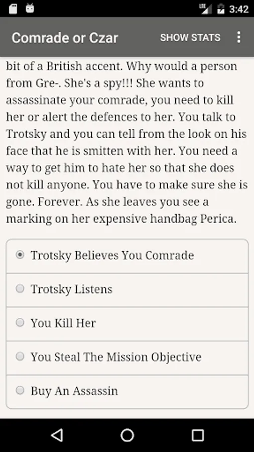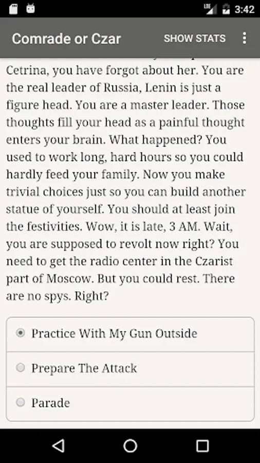 "Comrade or Czar" is a 60,000 word interactive novel by Albnoob, where your choices control the story. It's entirely text-based—without graphics or sound effects—and fueled by the vast, unstoppable power of your imagination.