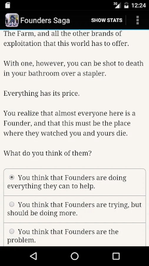 Founders Saga: The Culling is the first episode in an interactive science fiction novel by Steve Spalding. It begins your journey towards founding a startup, earning your Slowgun, and discovering who you can trust in a world where business is total war.