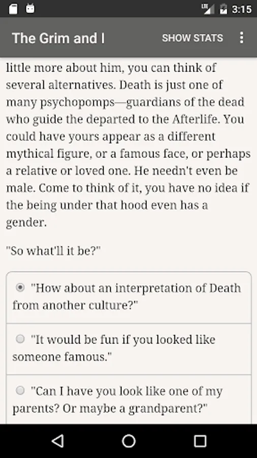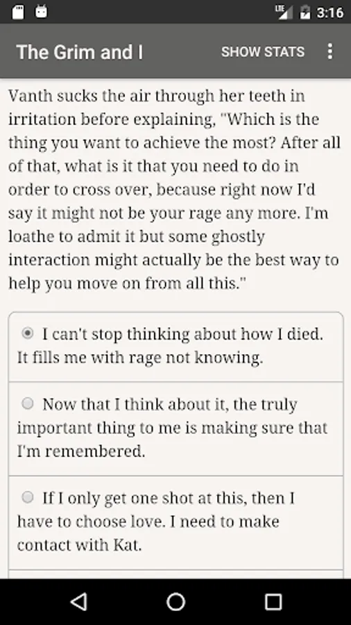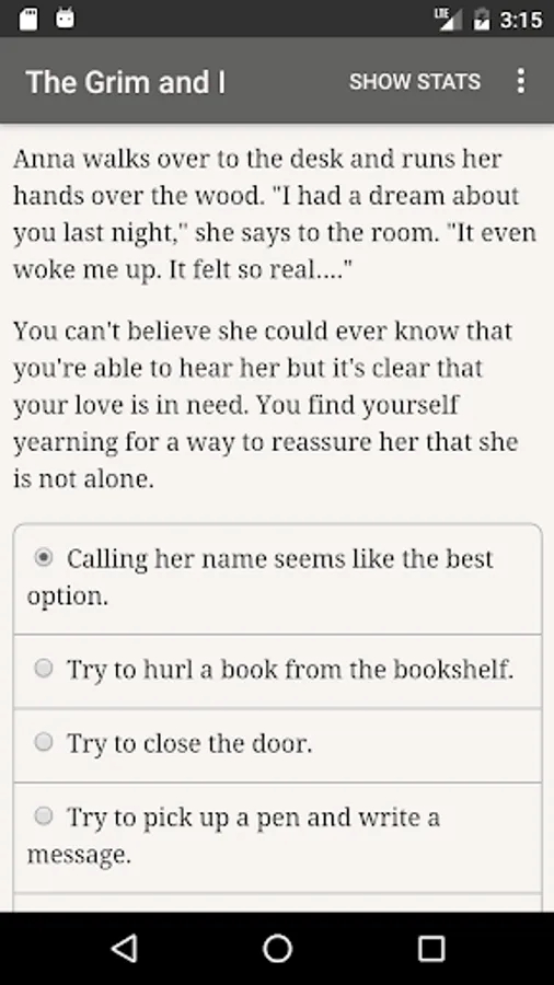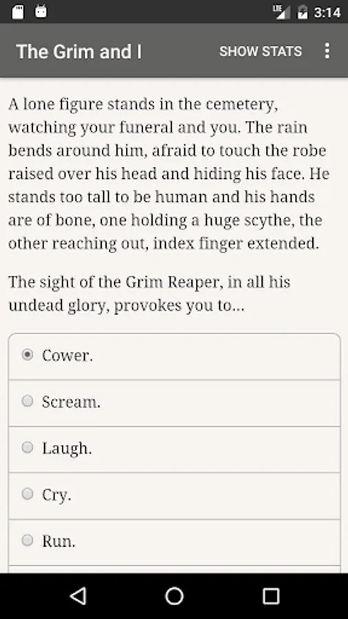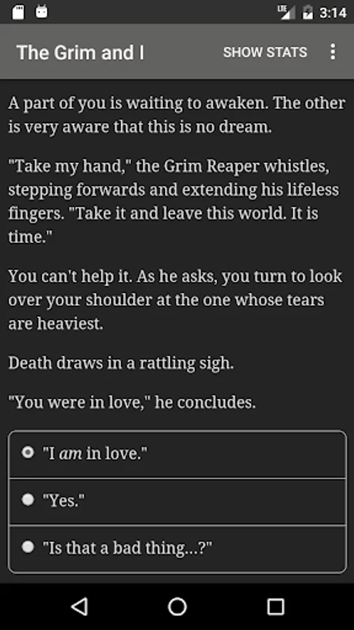 "The Grim and I" is a unique 155,000 word interactive novel by Thom Baylay, where your choices control the story. It's entirely text-based—without graphics or sound effects—and fueled by the vast, unstoppable power of your imagination.
