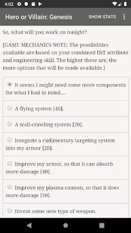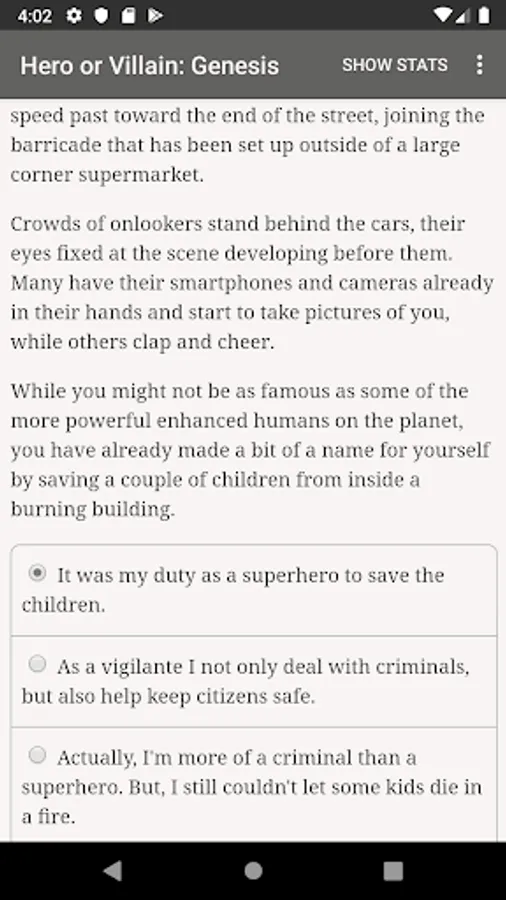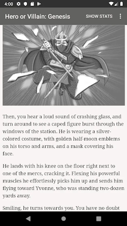 Hero or Villain: Genesis is a 330,000 word interactive novel by Adrao, where your choices control the story. The game is text-based, with artwork to help set the scene. Will you hunt down villains to the last corner of the planet, join a group of fellow heroes (or villains!), defeat New York's criminal mastermind, or even replace him?