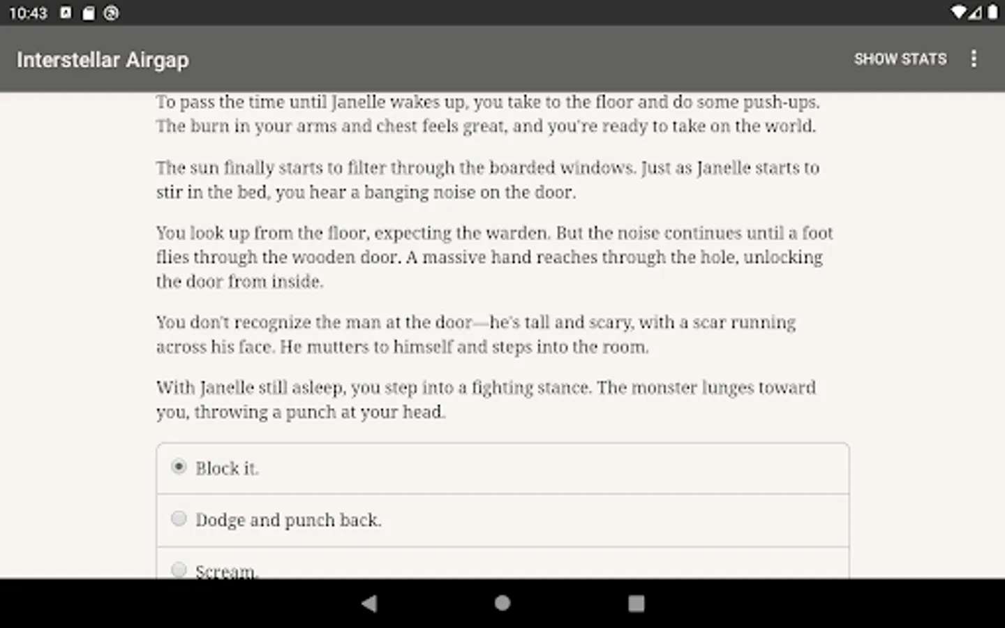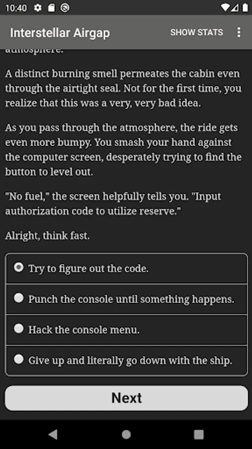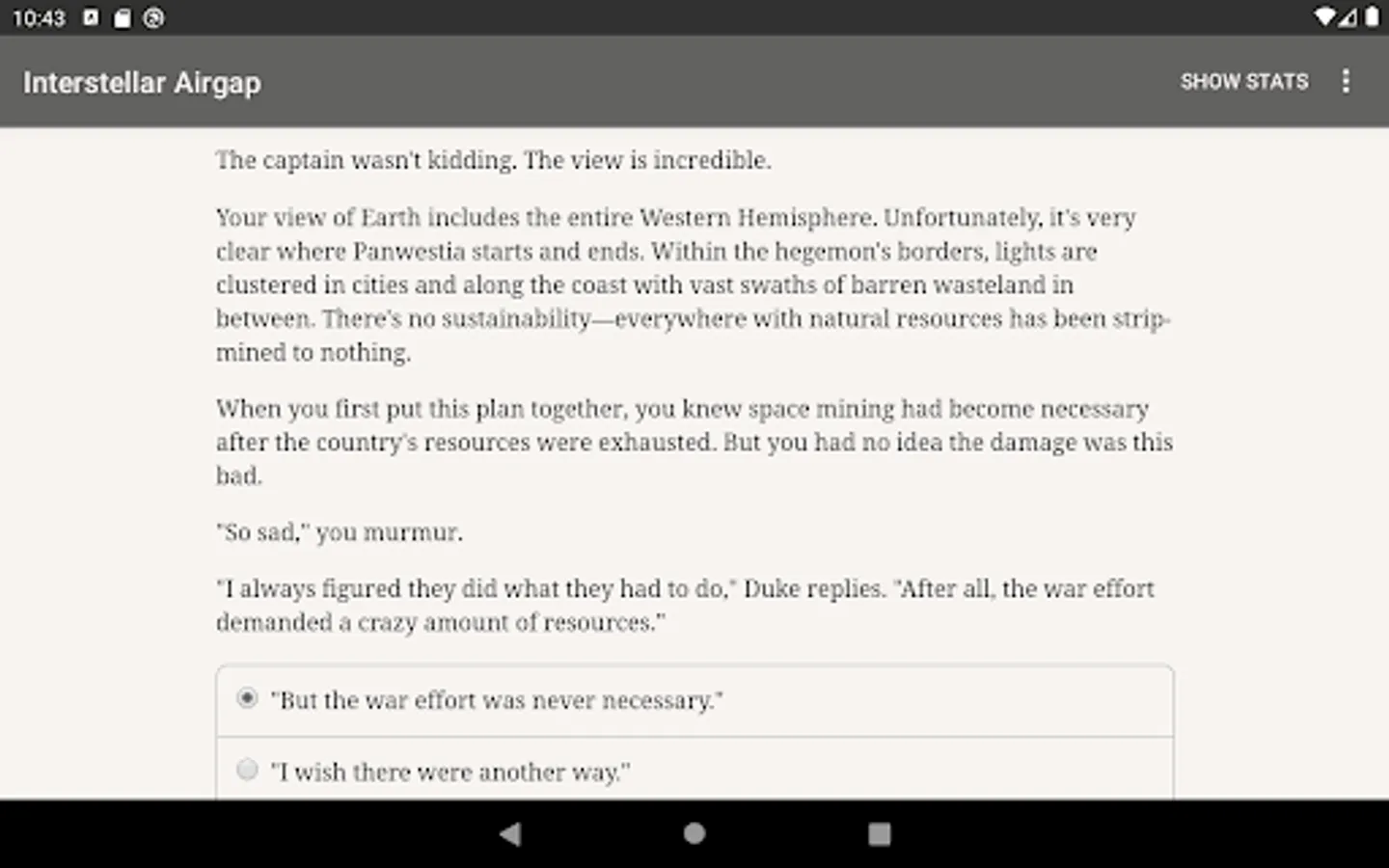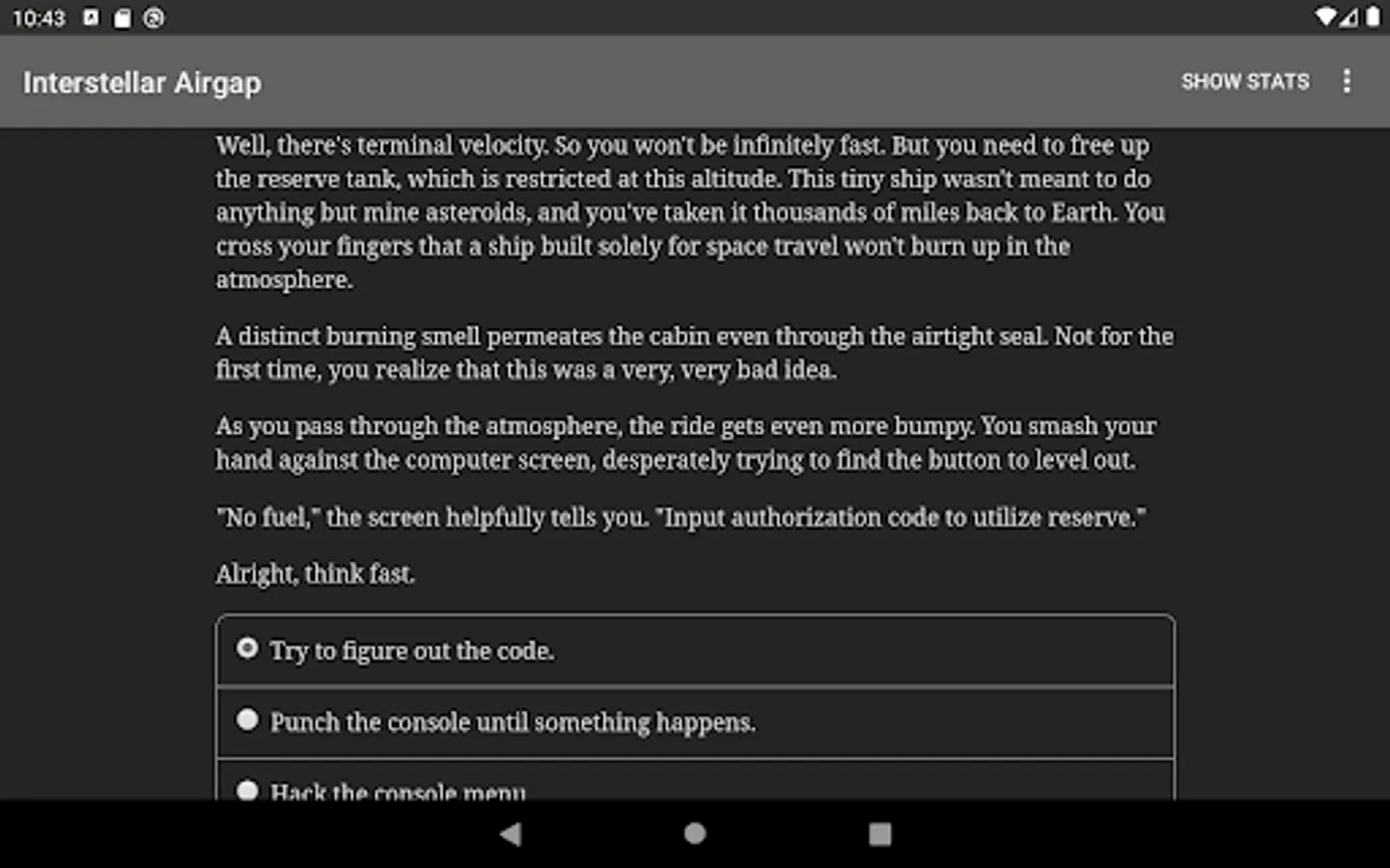 Interstellar Airgap is a thrilling 220,000-word interactive science fiction novel by John Lance, where your choices control the story. It's entirely text-based—without graphics or sound effects—and fueled by the vast, unstoppable power of your imagination.