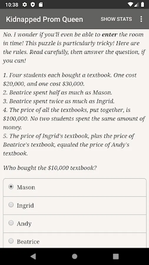 Terror has struck at Franklin High School! On the very day the prom court announcement, the prom queen is kidnapped! You and the rest of the prom committee members soon find yourself trapped in the school, held hostage by the scheming kidnapper. The only way to escape is to solve puzzles, search for clues, and go along with the culprit's twisted game...but could the villain be closer than you think?